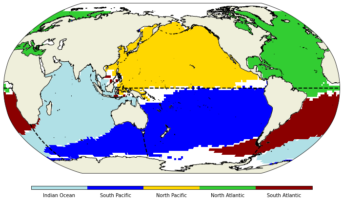 표면 연결성을 기반으로 정의된 해양 분지(Froyland et al., 2014). 검은색 점선은 "해양 및 바다의 경계"에서 정의된 분지를 나타낸다.