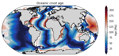해양 지각의 나이를 나타내는 도표. 파란색은 젊은 지각, 빨간색은 오래된 지각을 나타낸다. 짙은 파란색 "선"은 대륙붕이 만나는 지역이다. 데이터 출처: Heine, C., Yeo, L. G., & Müller, R. D. (2015).