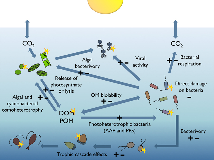 해양 생태계에서 바이러스의 역할과 같이 바닷속 미생물 생명체는 다양하지만 여전히 잘 이해되지 않고 있다.[235] 대부분의 해양 바이러스는 박테리오파지이며, 식물과 동물에게는 무해하지만 해수 및 담수 생태계 조절에 필수적이다.[236] 이들은 수생 미생물 군집에서 세균과 고세균을 감염시켜 파괴하며, 해양 환경에서 탄소 순환의 가장 중요한 메커니즘이다. 바이러스는 죽은 세균 세포에서 유기 분자를 방출하여 새로운 세균과 조류 성장을 촉진한다.[237] 바이러스 활동은 탄소가 심해에 탄소 격리되는 과정인 생물학적 펌프에도 기여할 수 있다.[238]