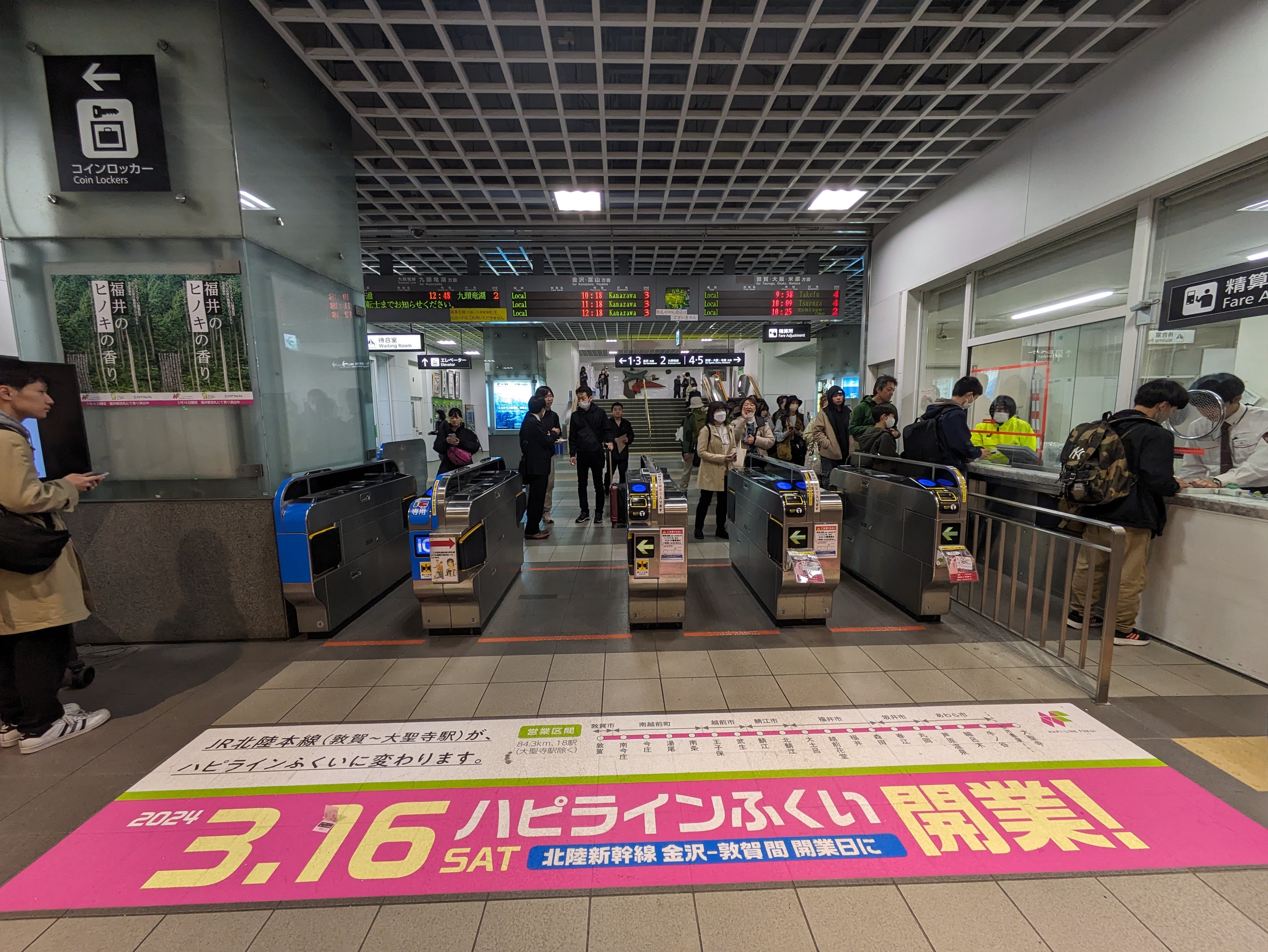2024년 3월 16일 개통한 해피라인 후쿠이선은 JR 서일본 호쿠리쿠 본선의 일부 구간(쓰루가역 - 다이쇼지역, 84.3km)을 이관받아 운영하는 노선이다.[6] 이 노선에는 20개의 역이 있으며, 쓰루가역은 JR 서일본이 계속 관리하고, 다이쇼지역은 IR 이시카와 철도로 이관되었다.[6]
