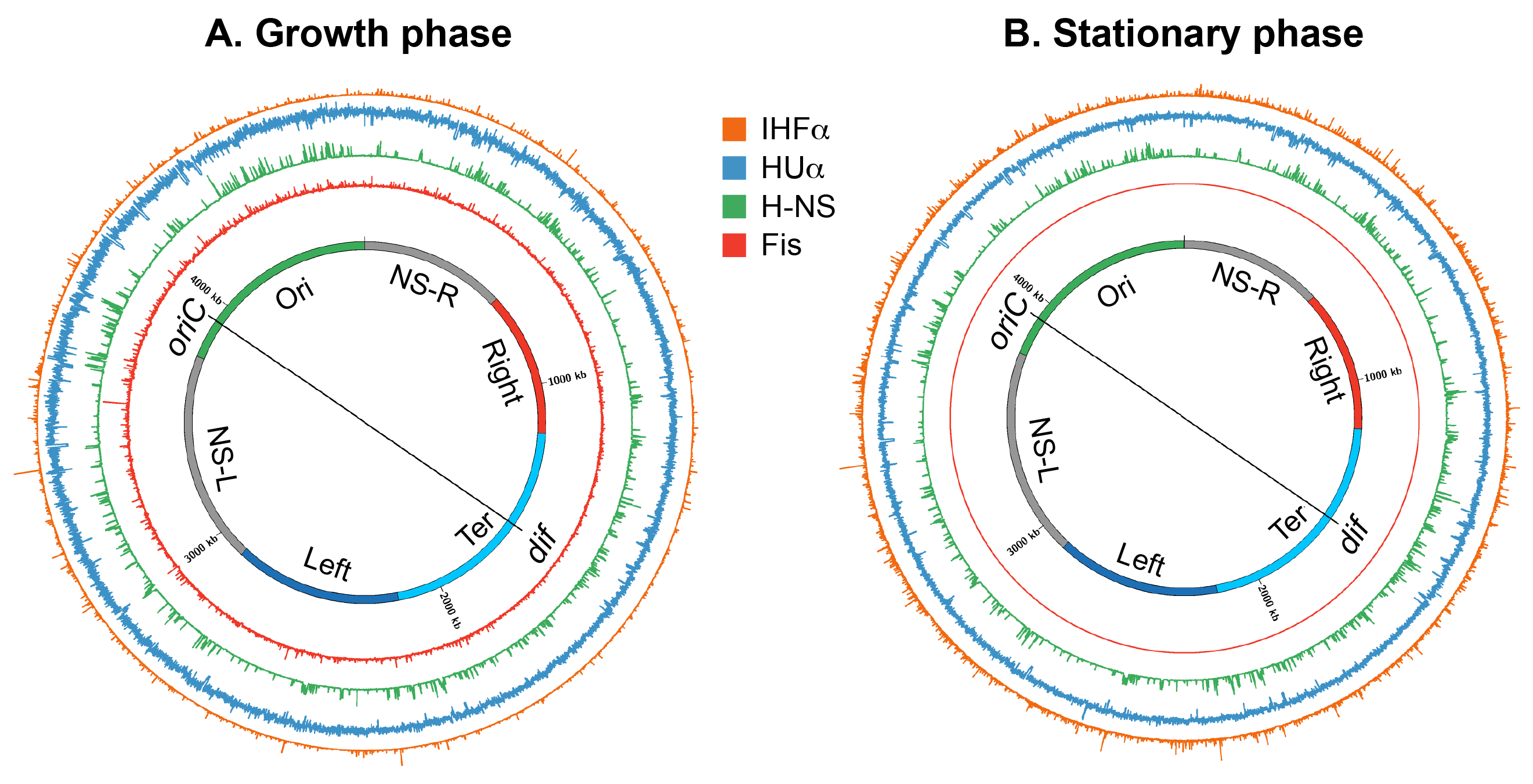 HU, IHF, H-NS는 성장기와 정지기 모두에 존재한다.[42] 그러나 이들의 양은 상당히 변화하여, HU와 Fis는 성장기에 가장 풍부한 NAP가 되고, IHF와 Dps는 정지기에 가장 풍부한 NAP가 된다.[42] HUαα는 초기 지수기에 우세한 형태이고, 이형이량체는 소량의 동형이량체와 함께 정지기에 우세하다.[128] 이러한 전환은 핵양체 구조와 관련하여 기능적 결과를 가져오는데, 두 형태가 DNA를 다르게 조직하고 응축하는 것으로 보이기 때문이다. 동형이량체와 이형이량체 모두 필라멘트를 형성하지만, 동형이량체만 여러 DNA 조각을 함께 연결하여 DNA 네트워크를 형성할 수 있다.[36] MukB의 복제수는 정지기에 두 배로 증가한다.[168][129] MukB 분자 수의 증가는 DNA 루프 돌출 인자로서 MukBEF 복합체의 공정성에 영향을 주어, 루프가 더 커지거나 더 많은 루프가 생성될 수 있다.[168][129]