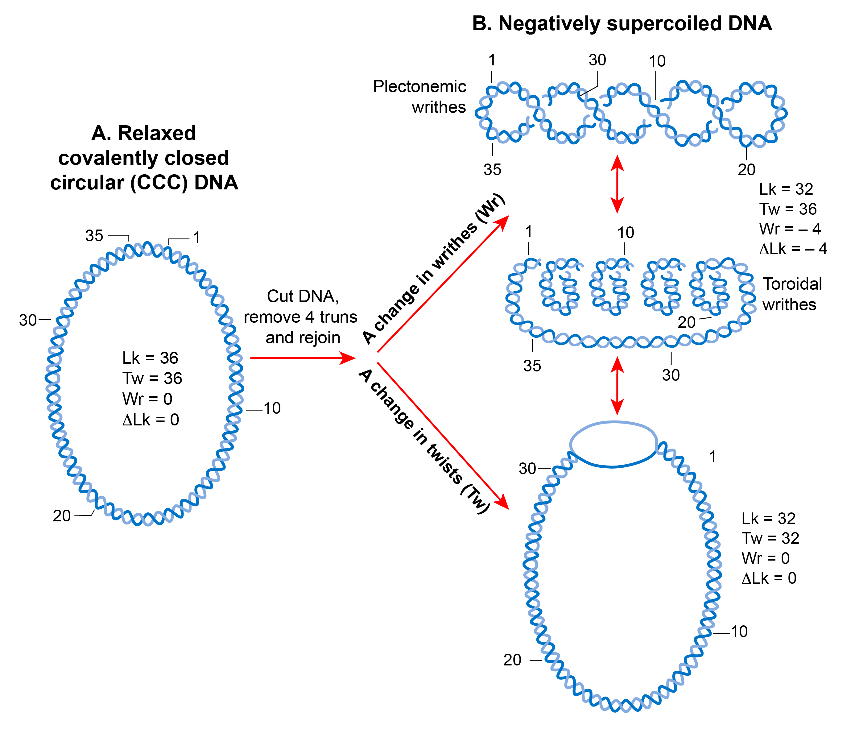 DNA 이중 나선 구조를 가진 이중 가닥 DNA 분자는 공유 결합으로 닫힌 원형 형태를 이루어 위상학적으로 제한되며, 자유단의 회전이 불가능하다.[87] 이러한 위상학적으로 제한된 DNA에서 두 가닥이 서로 교차하는 횟수는 연결 번호(Lk)로 표현되며, 이는 원형 분자의 나선 회전 수 또는 꼬임 수와 같다.[88]