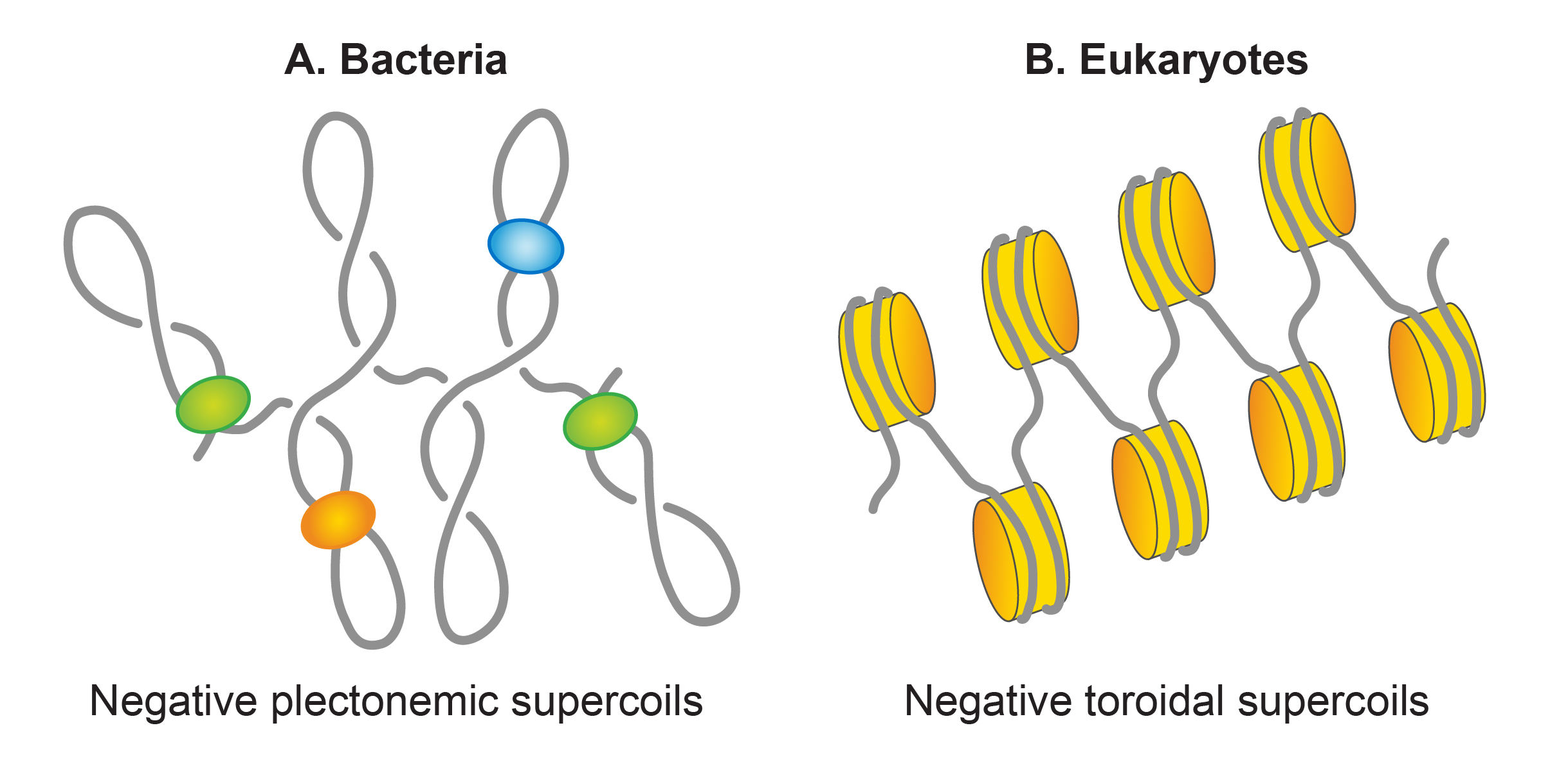 대부분의 세균에서 DNA는 초나선 형태로 존재한다. ''대장균'' 염색체의 원형 구조는 토폴로지적으로 제약된 분자를 만들며, 이는 대부분 음의 초나선 구조를 가지고, 추정되는 평균 초나선 밀도(σ)는 -0.05이다.[92] 진핵생물 염색질에서 DNA는 주로 뉴클레오솜 형성을 통해 히스톤에 의해 억제되고 정의되는 토로이드 형태로 발견된다. 반대로, ''대장균'' 핵양체에서 염색체 DNA의 약 절반은 자유로운 꼬인 초나선 형태로 구성된다.[93][94][95] 나머지 DNA는 핵양체 연관 단백질(NAPs)과 같은 단백질과의 상호작용을 통해 꼬인 형태 또는 토로이드 형태를 포함하되 이에 국한되지 않는 다른 형태로 억제된다.