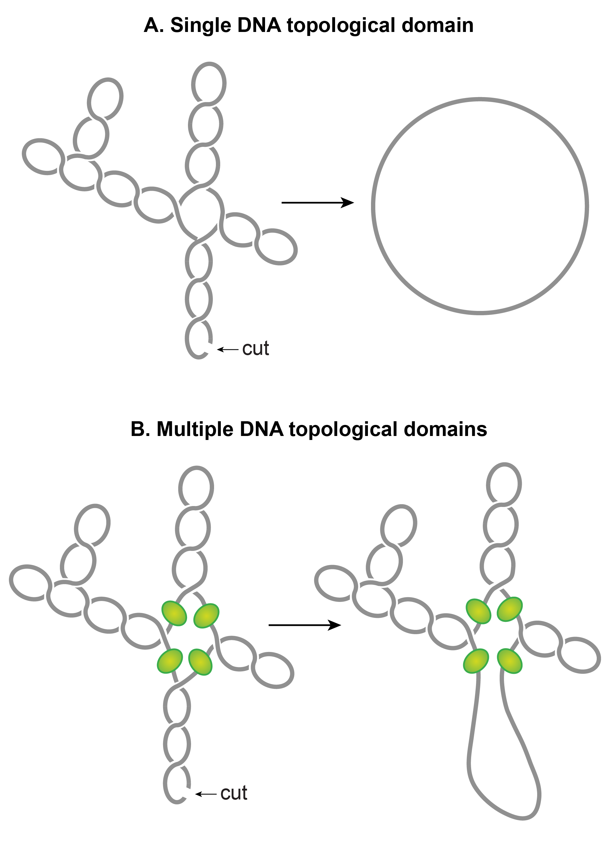 '''A.''' 초나선 DNA의 단일 위상 도메인 그림. 어느 곳에서든 단일 이중 가닥 절단만으로도 전체 도메인의 초나선 응력을 완화하기에 충분하다.