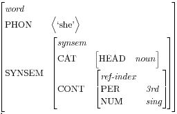 "Walks"는 유형이 ''word''이고, head가 ''verb''인 기호이다. 자동사로서 "walks"는 보어가 없지만 3인칭 단수 명사인 주어를 필요로 한다. 주어의 의미 값(CONTENT)은 동사의 유일한 인수(걷는 개체)와 동일하게 색인된다. "she"에 대한 다음 AVM은 이러한 요구 사항을 충족할 수 있는 SYNSEM 값을 가진 기호를 나타낸다.