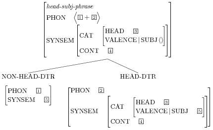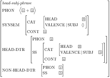 ''phrase'' 유형의 기호는 하나 이상의 자식과 통합하고 정보를 위로 전파한다. 다음 AVM은 두 개의 자식(head 자식(동사)과 동사의 SUBJ 제약을 충족하는 비 head 자식)이 필요한 ''head-subj-phrase''에 대한 즉시 지배 규칙을 인코딩한다.