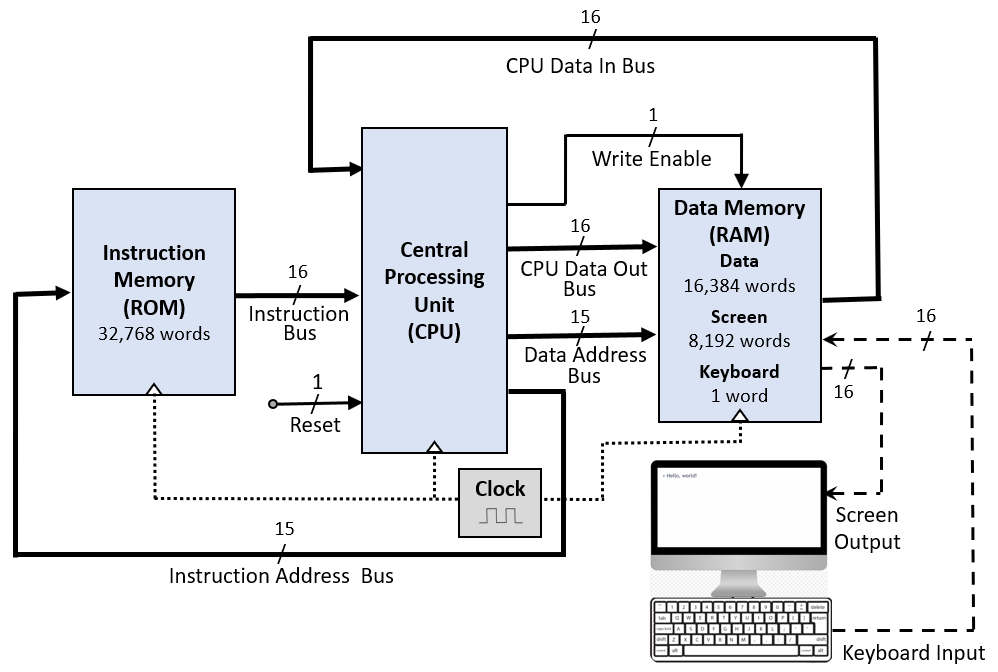 핵(Hack) 컴퓨터 하드웨어는 블록 다이어그램에 나타난 것처럼 세 가지 기본 요소로 구성된다. 이는 두 개의 별도 16비트 메모리 장치와 중앙 처리 장치(CPU)이다. 데이터는 16비트 워드 단위로 컴퓨터 내에서 이동하고 처리되므로, 핵 컴퓨터는 16비트 아키텍처로 분류된다.