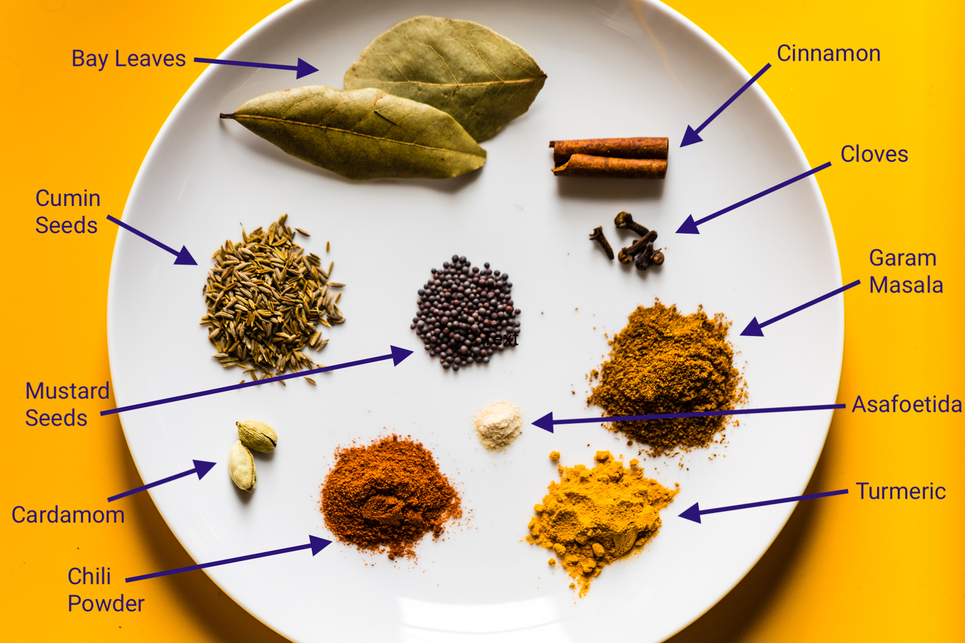 식물 | 씨앗 (예: 고수, 커민) 열매 (예: 고추, 후추) 껍질 (예: 계피) 뿌리 (예: 생강, 강황) |