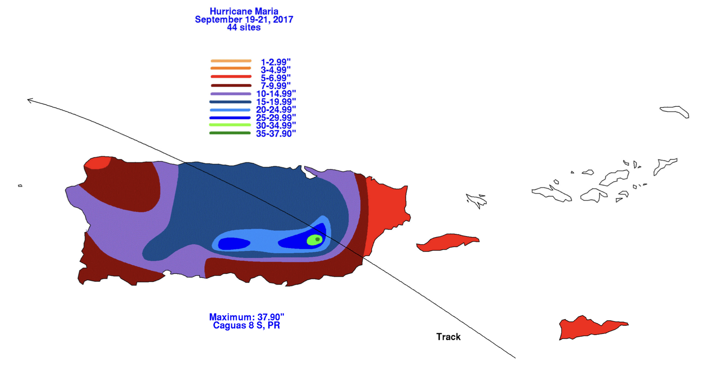 카구아스에서 약 96.27cm로 최고치를 기록하는 등 영토 전역에 걸쳐 폭우가 쏟아졌다.[92] 마리아가 카테고리 4등급으로 약화되도록 한 눈벽 교체 주기는 상륙 전에 눈의 크기가 세 배로 커지면서 직경이 9nmi에서 28nmi로 확장되었다. 이로 인해 섬에서 강한 바람의 영향을 받는 지역이 훨씬 더 넓어졌다.[7]