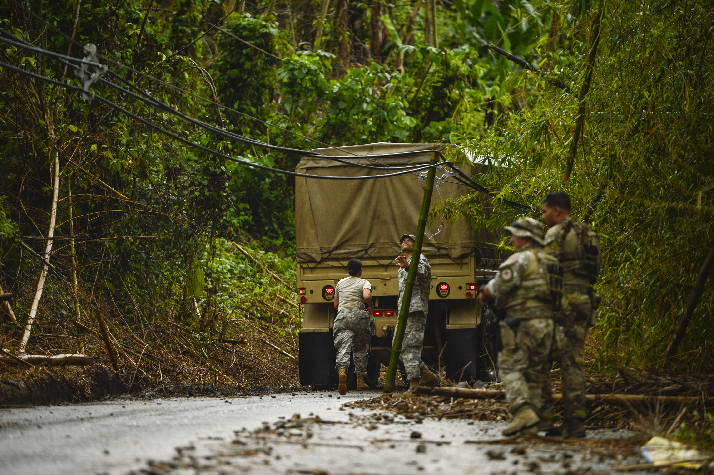 미국 운송 사령부는 켄터키주 포트 캠벨에서 추가 인력과 8대의 미 육군 UH-60 블랙 호크 헬리콥터를 루이스 무뇨스 마린 국제공항으로 이동하여 배포 능력을 향상시켰다.[154] 미국 공병대는 전력망을 평가하고 복구하는 데 참여한 670명의 인력을 배치했으며, 9월 25일까지 83개의 발전기가 설치되었고 186개의 발전기가 추가로 이동 중이었다.[154] 2017년 9월 26일까지, 미국 정부 기관은 400만 개의 식사, 6ML의 물, 7만 개의 방수포 및 1만 5천 롤의 지붕 시트를 배포했다.[157] 주 방위군 병력이 소집되어 코네티컷, 조지아, 아이오와, 일리노이, 켄터키, 미주리, 뉴욕, 로드아일랜드, 위스콘신에서 푸에르토리코로 파견되었다.[158]