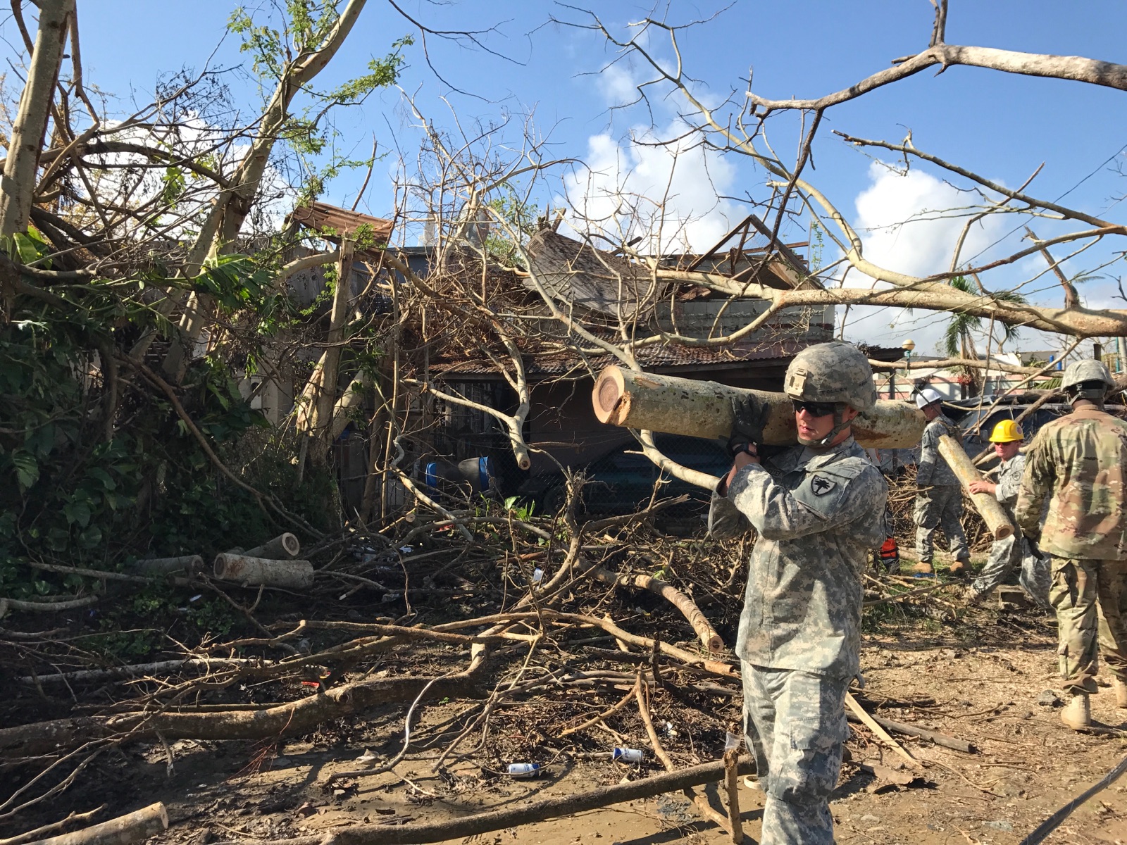 9월 27일, 펜타곤은 푸에르토리코의 두 개의 주요 비행장을 재개장하고 구호 활동을 지원하기 위해 항공기, 특수 부대 및 병원선을 보내기 시작했다. 미국 육군 북부 사령부 부사령관인 리처드 C. 김 준장은 군, FEMA 및 기타 정부 기관, 민간 부문 간의 작전을 조정하는 책임을 맡았다.[163] 엄청난 양의 물, 식량 및 연료가 푸에르토리코 항구로 배달되었거나 상품을 내륙으로 운송할 트럭 운전사가 부족하여 미국 본토의 항구에 묶여 있었다. 통신망의 부족은 노력에 지장을 주었으며 운전자 중 20%만이 출근했다고 보고했다.[164] 9월 28일까지, 산후안 항구는 받은 배송의 4%만 발송할 수 있었고 추가 배송을 수락할 여유 공간이 거의 없었다.[165] 9월 28일까지, 인구의 44%가 식수를 사용하지 못했고 미군은 "단기적, 해상 기반 대응에서 견고하고 장기적인 지원을 제공하도록 설계된 주로 육상 기반 노력"으로 전환했으며 연료 배달이 최우선 과제였다.[166] 육군 주 방위군과 해병 원정대(MEU) 합동 팀은 이전 루즈벨트 로드 해군 기지에 설치 기지를 설립했다. 그들은 헬리콥터를 통해 푸에르토리코 전역의 병원에 보건복지부 평가 팀을 수송하여 의료 요구 사항을 결정했다.[166] 9월 29일, 상륙돌격함 USS Wasp는 도미니카 섬에 구호 활동을 제공한 후 푸에르토리코로 전환되었다.[167] 9월 30일까지, FEMA 관리 알레한드로 데 라 캄파는 섬의 5%의 전력, 33%의 통신 인프라, 50%의 급수 서비스가 복구되었다고 말했다.[168]