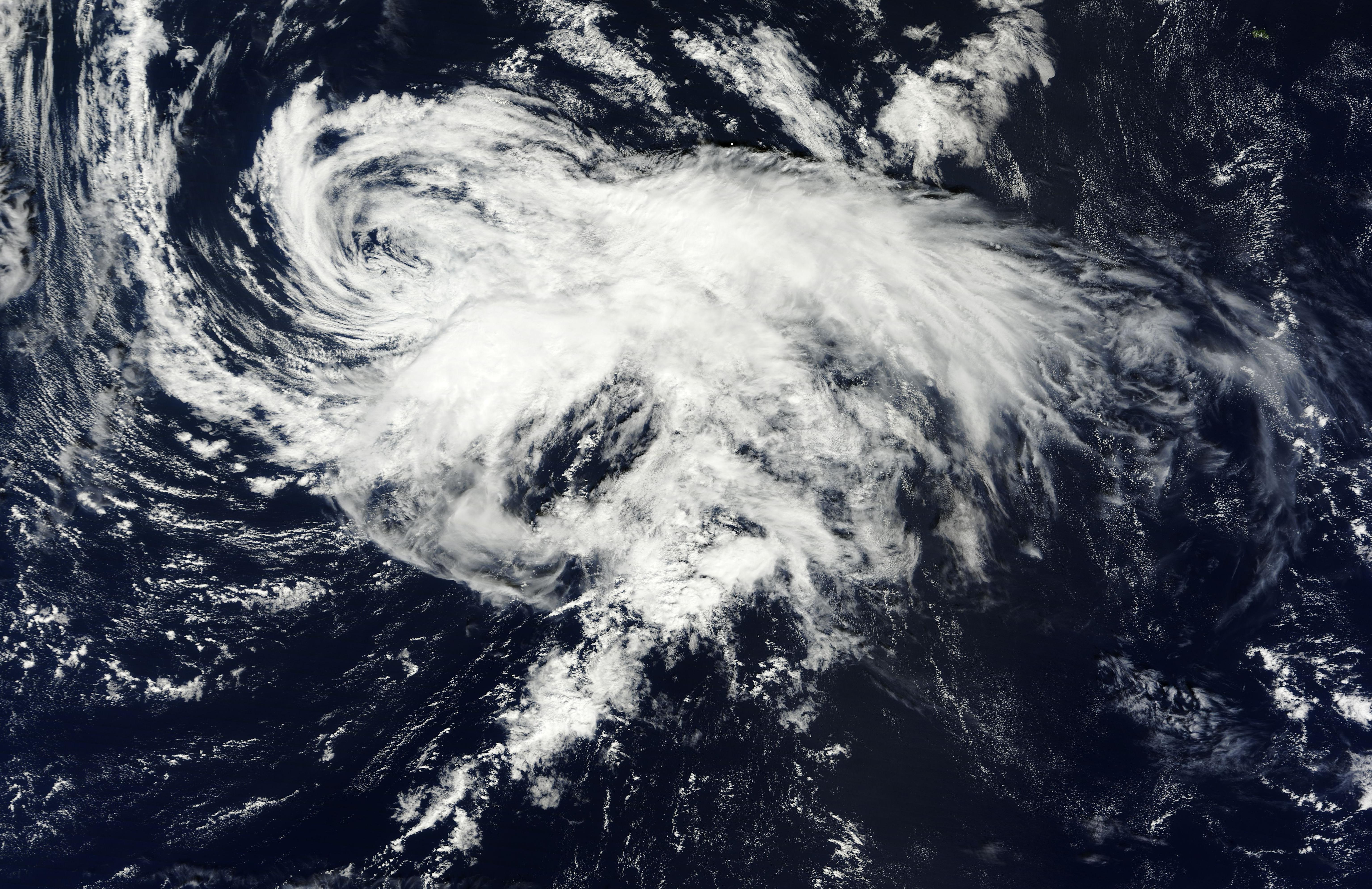 10월 3일 아조레스 제도에 다시 접근하는 열대 폭풍 나딘. 나딘은 조직이 잘 되어 있지 않고, 불규칙한 띠 모양을 보이며, 부분적으로 노출된 순환 중심을 가지고 있다.