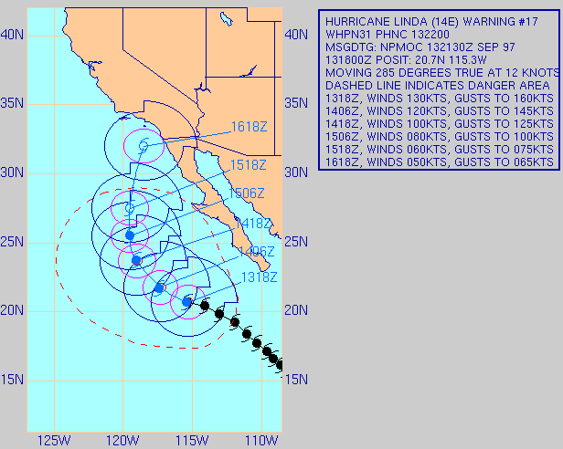 최성기를 맞이한 후, 린다[1]는 사피어-심프슨 허리케인 등급 제5등급의 세력으로 소코로섬 근처를 지나갔다.[5] 당시 기상 예보관들은 린다가 북쪽으로 이동하여 미국 캘리포니아주 남부에 접근할 것이라고 예측했다.[1][6] 린다가 캘리포니아주에 상륙했다면, 그 때는 이미 세력이 많이 약해져 열대 폭풍의 세력이었을 것으로 예상되었다.[3] 그러나 예상과는 달리, 허리케인 린다는 육지에서 서북서쪽으로 방향을 틀었다.[1] 린다가 육지에서 멀리 떨어져 있었음에도 불구하고, 캘리포니아 주에는 비구름이 몰려와 비가 내렸다.[3]