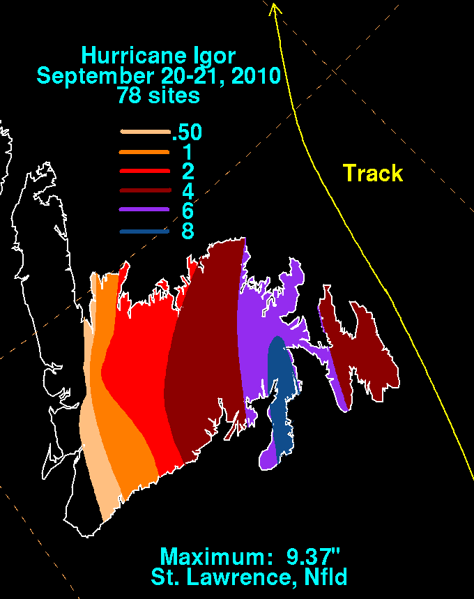 정체 전선과 허리케인 이고르의 습기가 결합하여 뉴펀들랜드 동부 일부 지역에 폭우를 쏟아 광범위한 홍수가 발생했다.[32][31] 보나비스타에서는 약 25.40cm 이상,[2][33] 세인트 로렌스에서는 약 23.80cm의 강우량이 기록되어 캐나다 역사상 세 번째로 강수량이 많은 열대 저기압이 되었다.[31] 케이프 파인에서는 80mph의 지속적인 풍속과 107mph의 돌풍이 관측되었다.[2] 해안에서는 약 1.07m의 폭풍 해일이 발생했고, 해상 파도는 최대 약 25.48m에 달했다.[2]