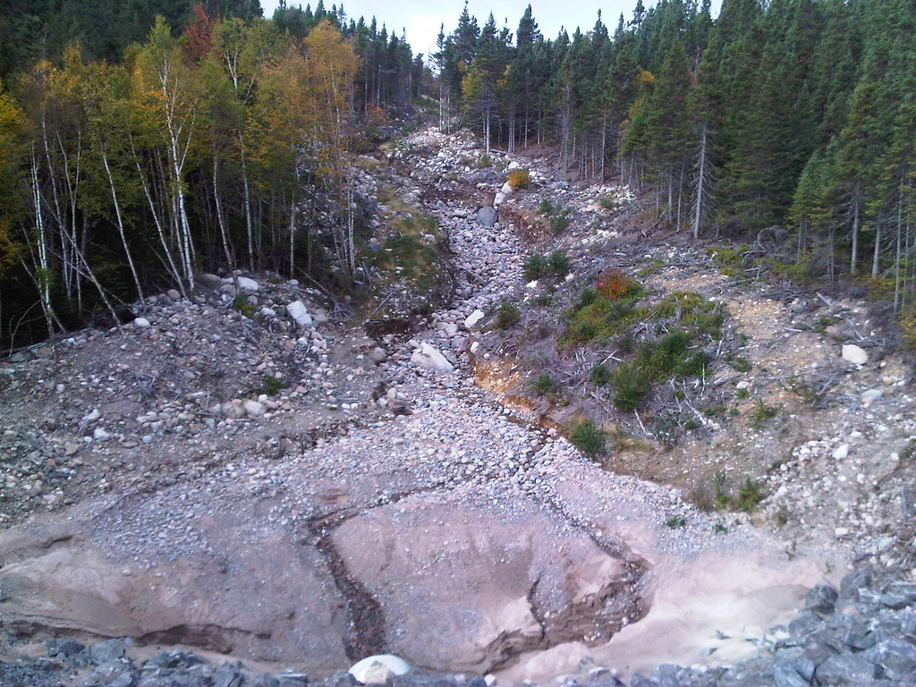 폭우로 인해 보나비스타 반도와 부린 반도 전역의 여러 강이 기록적인 수위로 상승하여 많은 도로가 유실되고 다리, 주택, 도로 일부가 파괴되었다.[33] 홍수 수위가 주택 높이를 넘어서기도 했다.[29] 뉴펀들랜드 파워 주식회사(Newfoundland Power Inc.)는 주민들에게 지하실 침수 시 배전반 전원을 차단하라고 경고했다.[34] 세인트 버나드-자크 퐁텐, 클라렌빌[29][35], 서니사이드 등 일부 지역에서는 주민들이 대피해야 했다.[35] 글로버타운에서는 끊어진 전선으로 인해 화재가 발생하기도 했다.[35]
