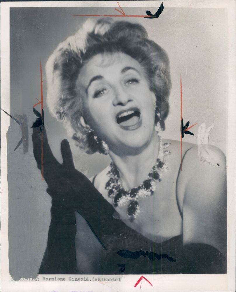 허마이어니 깅골드는 1951년 미국으로 건너가 매사추세츠주 케임브리지의 브래틀 극장에서 공연된 레뷔 "그것은 시간에 관한 것이다"에 출연했다.[26] 1953년 12월, 깅골드는 존 머레이 앤더슨의 앨마낵에 출연하여 브로드웨이에서 즉시 성공을 거두었으며, 1954년 도널드슨 상을 수상했다.[26] 또한, 그녀는 토크쇼의 고정 게스트로 출연하며 대중적인 인지도를 높였다.[5] 1956년에는 버스터 데이비스가 음악 감독을 맡은 재즈 카바레 앨범 ''라 깅골드(la gingold)''를 발매했다.[5]깅골드는 영화계에서도 활발하게 활동했다. 1956년 영화 ''80일간의 세계 일주''에서 런던의 "스포츠 레이디" 역을 맡았고,[16] 1958년 영화 ''지지''에서 알바레즈 부인 역을 연기하여 골든 글로브상 영화 부문 여우조연상을 수상했다. 이 영화에서 그녀는 모리스 슈발리에와 함께 "I Remember It Well"을 불렀다.[17] 깅골드는 1958년에 또 다른 히트작인 ''벨, 북 앤드 캔들''에 출연했다.[18] 이후 1962년에는 영화 ''음악가''에서 율랄리 매케크니 신 역을 맡아 로버트 프레스턴, 셜리 존스와 함께 연기했다.[19] 1963년 10월, 깅골드는 아서 코피트의 ''오, 아빠, 가엾은 아빠, 엄마는 당신을 벽장에 매달아 놓았고, 전 너무 슬퍼요''에서 아들을 미치게 만드는 끔찍할 정도로 소유욕이 강한 어머니 역으로 출연했고, 1965년 런던 프로덕션에서도 같은 역을 연기했다.[20]