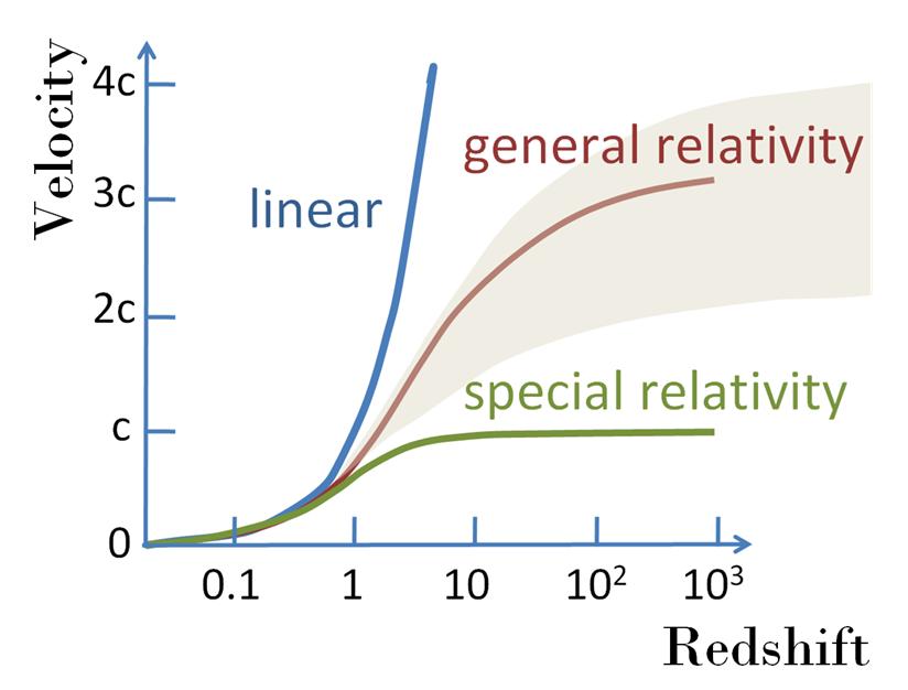 다양한 후퇴 속도 대 적색편이 함수. 일반 상대성 이론 및 특수 상대성 이론에 따른 곡선(빛보다 빠른 속도 허용 안 함). 모든 곡선은 낮은 적색편이에서 선형.