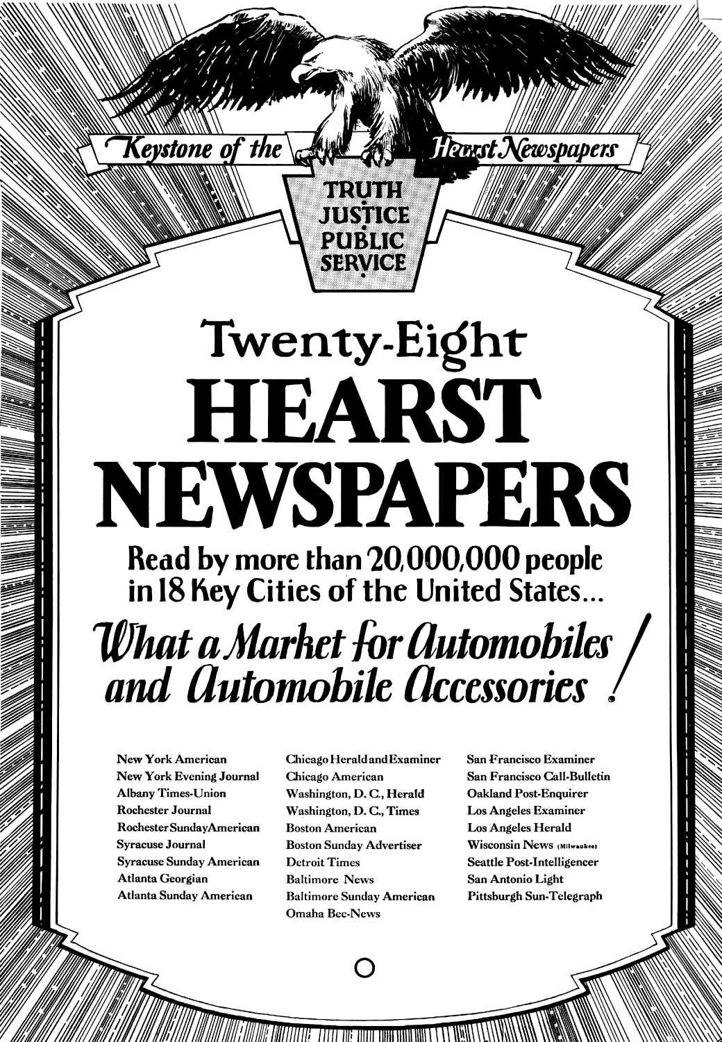 1920년대와 1930년대에 허스트는 주요 도시에 여러 잡지와 신문을 소유한 세계 최대의 미디어 재벌을 소유하고 있었다. 허스트는 신문을 보완하기 위해 라디오 방송국도 인수하기 시작했다.[18] 1920년대 초, 허스트는 회사 자금으로 샌 시메온에 허스트 캐슬을 건설하고 코스모폴리탄 프로덕션에서 영화 제작을 지원하면서 재정적 어려움을 겪었다. 이는 결국 1925년 잡지 ''Hearst International''과 ''코스모폴리탄''의 합병으로 이어졌다.[19]