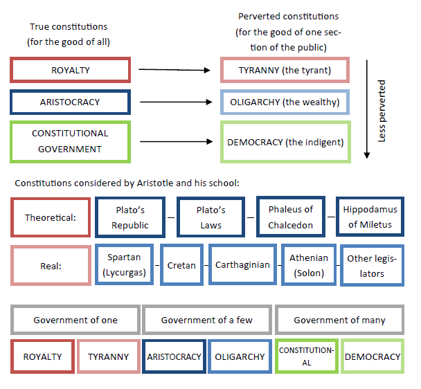 아리스토텔레스(약 기원전 350년경)는 기록상 처음으로 일반 법과 헌법적 법을 공식적으로 구분한 사람 중 한 명이다. 헌법과 헌법주의의 개념을 만들고, 헌법적 정부의 서로 다른 형태를 분류하려고 시도했다. 아리스토텔레스는 헌법의 기본적인 정의를 "국가 내의 관청/직무의 배치"라고 했다. 저서 『아테네 정치제』, 『정치학』, 『니코마코스 윤리학』에서 아테네, 스파르타, 카르타고 등 당시 여러 국가의 서로 다른 헌법들을 조사하고 있다. 아리스토텔레스는 그가 좋다고 여긴 것과 나쁘다고 여긴 것을 모두 분류하고, 결론적으로 최선의 헌법은 군주제와 귀족제와 민주제의 요소를 섞은 시스템이라고 했다. 또한 시민을 구분하여 국가에 참여할 권리가 있는 자와 없는 비시민 및 노예로 나누었다.[171]
