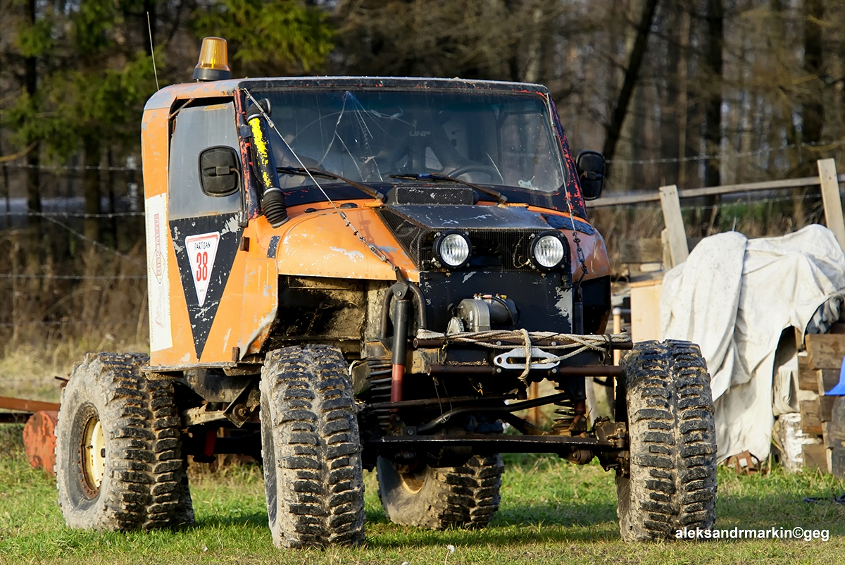 - '''보호 장비''': 험로 주행 중 지면의 돌이나 장애물로부터 차량 하부의 주요 부품(엔진, 변속기, 연료 탱크, 구동계 등)을 보호하기 위해 금속이나 FRP 재질의 스키드 플레이트를 장착하는 경우가 많다. 또한 전복 사고 시 탑승 공간을 보호하기 위한 롤 케이지나, 깊은 물을 건널 때 엔진으로 물이 유입되는 것을 막는 스노클 등을 추가로 장착하기도 한다.[2][3]