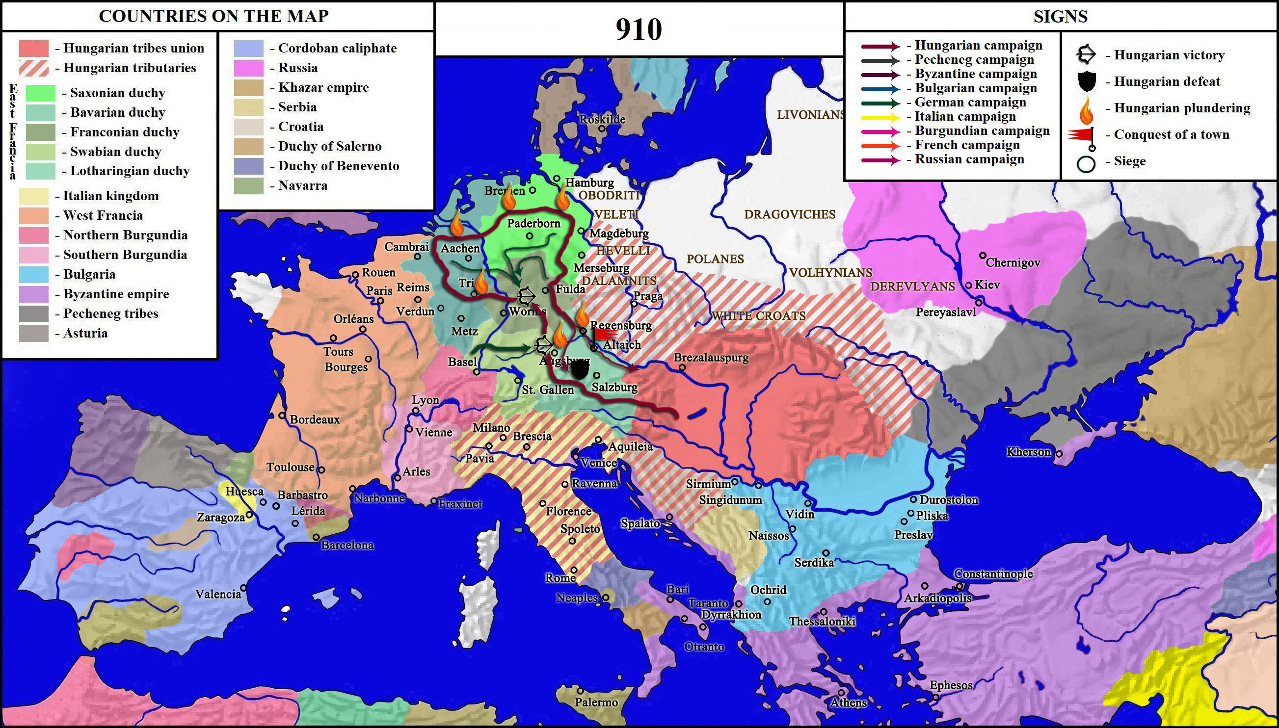 헝가리 대공국은 군사력을 새롭게 갖춘 전사 국가로서, 콘스탄티노폴리스에서 스페인 중부에 이르기까지 광범위한 지역에서 활발한 약탈을 감행했다. 907년에서 910년 사이에 3개의 주요 프랑크 제국군이 헝가리인에게 결정적으로 패배했다.[33]