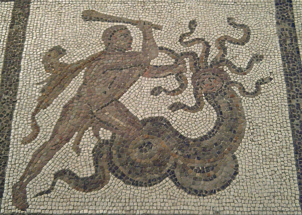 헤라클레스는 레르나 호수 근처 늪지에서 히드라와 싸웠는데, 머리 하나를 자를 때마다 새로운 머리(혹은 두 개)가 다시 자라났다. 게다가 거대한 게가 히드라를 도와 헤라클레스의 발을 물었다. 헤라클레스는 게를 죽였지만, 혼자서는 히드라를 이길 수 없음을 깨닫고 조카 이올라오스에게 도움을 요청했다. 헤라클레스가 머리를 자르면 이올라오스는 불덩이로 그루터기를 태워 다시 자라나는 것을 막았다. 아폴로도로스에 따르면 히드라의 머리 중 가운데 머리는 불멸이었는데, 헤라클레스가 이 머리를 잘라내 묻고 그 위에 큰 바위를 올려놓았다.[12]