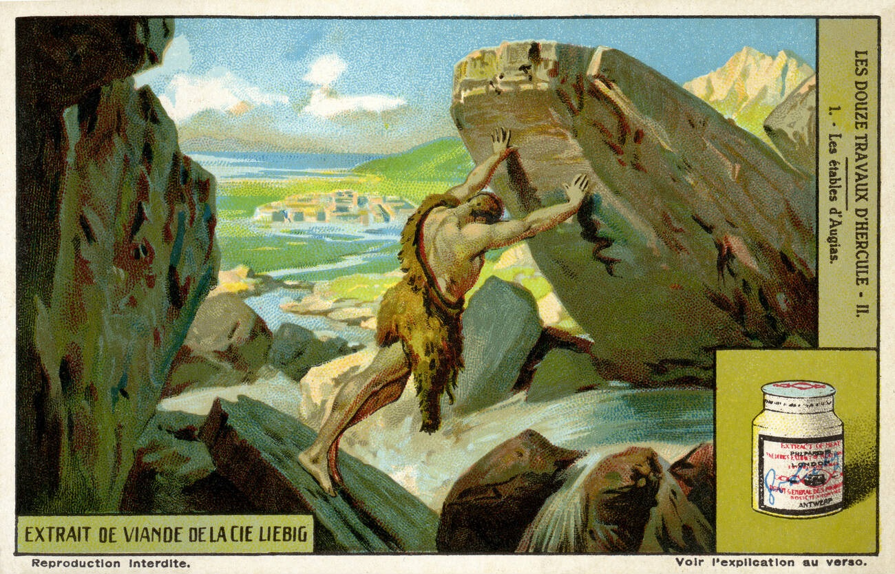헤라클레스의 다섯 번째 과업은 아우게이아스 왕의 외양간을 청소하는 것이었다. 이 과업은 굴욕적이고 불가능하게 여겨졌는데, 외양간은 30년 넘게 청소되지 않았고 1,000마리가 넘는 소가 살고 있었기 때문이다. 게다가 이 가축들은 신성한 가축이라 불멸이었고 엄청난 양의 배설물을 쏟아냈다.헤라클레스는 알페이오스 강과 페네이오스 강의 물줄기를 돌려 오물을 씻어냄으로써 이 과업을 성공적으로 완수했다.[14] 헤라클레스는 과업을 시작하기 전에 아우게이아스에게 하루 만에 과업을 완수하면 가축의 10분의 1을 달라고 요청했고, 아우게이아스는 동의했다. 그러나 아우게이아스는 헤라클레스가 에우리스테우스의 명령으로 이 과업을 수행했다는 것을 알고 합의를 이행하지 않았다. 헤라클레스는 법정에서 보상을 요구했고 아우게이아스의 아들 필레우스의 지지를 받았다. 하지만 아우게이아스는 법원이 판결을 내리기 전에 그들을 모두 추방했다.