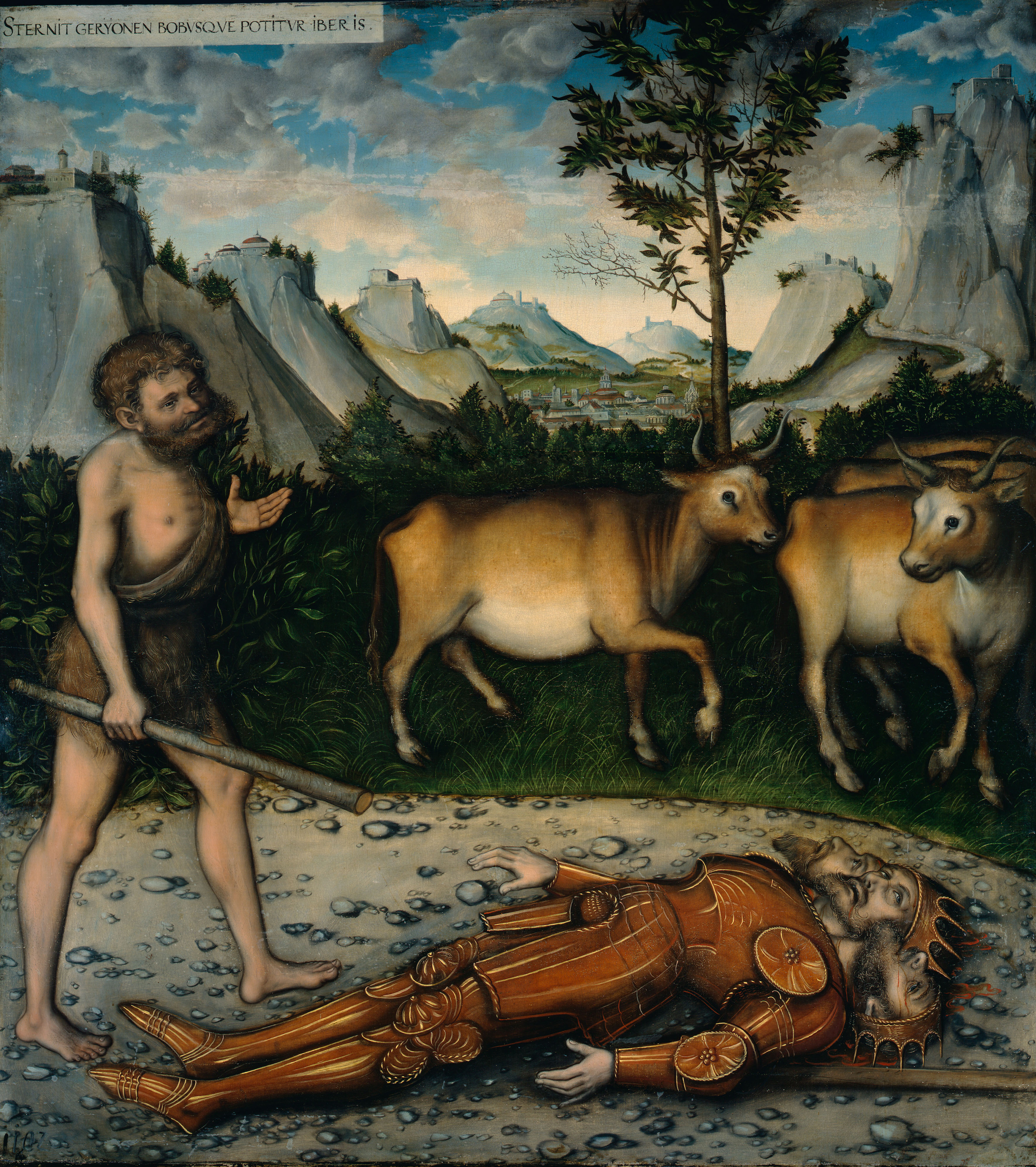 헤라클레스가 소 떼를 몰래 몰고 가던 중, 에우뤼티온과 머리가 둘 달린 개 오르토스에게 발각되었다. 헤라클레스는 그들을 죽이고 소를 배로 몰고 갔다. 나중에 이 사실을 안 게리온이 추격해 왔지만, 헤라클레스는 독 화살로 게리온을 처치했다.[38]