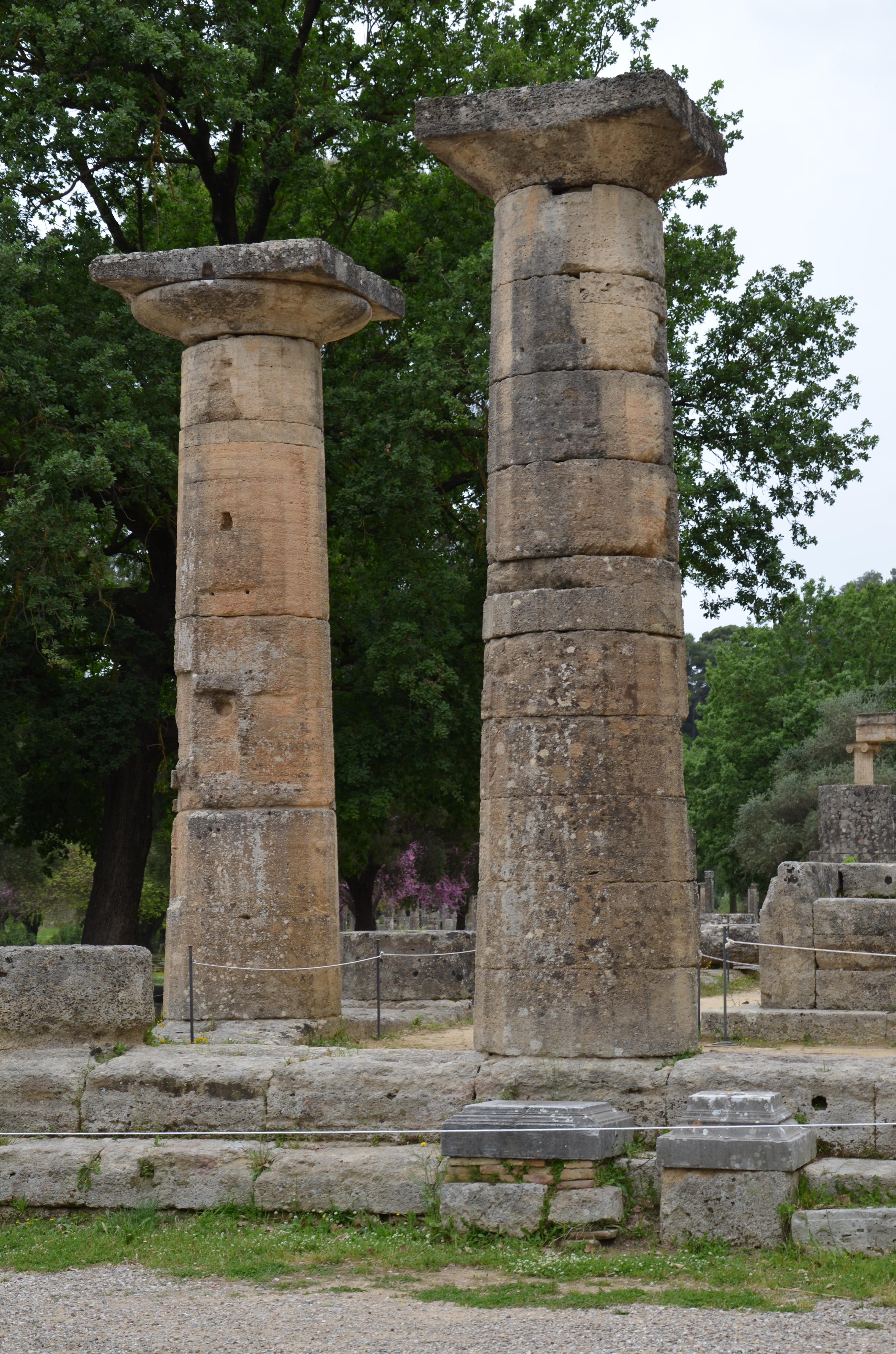 이 신전의 원래 나무 기둥은 기원전 6세기 중반부터 서기 시대까지 점차 돌로 만들어진 기둥으로 교체되었다. 서기 173년에는 오피스토도모스에 있는 두 기둥 중 하나가 여전히 참나무였다.[5] 교체가 고대 그리스 시대와 고대 로마 시대 사이의 매우 다양한 시기에 걸쳐 이루어졌고, 각 시대의 동시대 양식의 영향을 받아 조각되었기 때문에, 기둥들은 비율과 세부 사항에서 상당히 다르다. 이것은 기둥의 주두에서 분명하게 나타나는데, 각 주두가 다음 주두와 약간씩 다르기 때문이다. 또한 기둥의 기둥 몸통은 직경이 거의 약 0.30m 차이가 나며, 심지어 홈의 수도 나머지 기둥과 다르다. 또 다른 이론에 따르면, 기둥이 이처럼 다른 이유는 나무 기둥이 교체되었기 때문이 아니라, 다양한 작업장에서 동시에 다른 돌 기둥을 세웠기 때문일 수 있다.[6] 아마도 각 양식은 올림피아가 범도리아 성소였기 때문에 이러한 건축가들이 일했던 주요 도시 국가 또는 개인 기증자를 나타냈을 것이다. 기둥 위에 있는 엔타블레이처의 잔해는 발견되지 않았지만, 나무로 만들어진 것으로 추정된다.