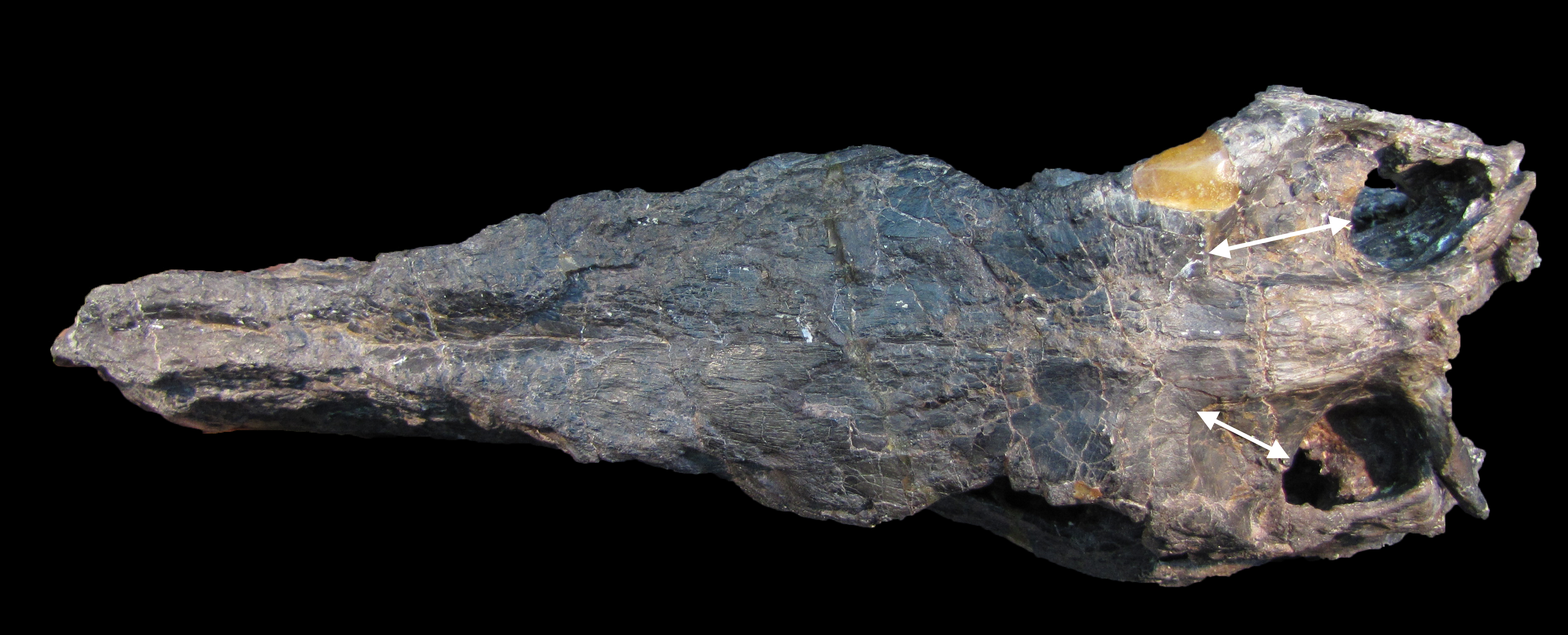 두개골에는 총 다섯 쌍의 구멍(두개골 창)이 있었는데, 눈과 콧구멍을 위한 구멍 외에도 두 쌍의 눈구멍(antorbital fenestrae)과 눈과 콧구멍 사이에 약 1cm 크기의 작은 틈새인 전상악공(promaxillary fenestra)이 존재했다.[38] 또한 전상악골과 상악골 사이에도 구멍이 있었다.[41] 특징적으로 전상악골은 높이가 있으며, 전안와창은 절제된 형태를 띤다.
