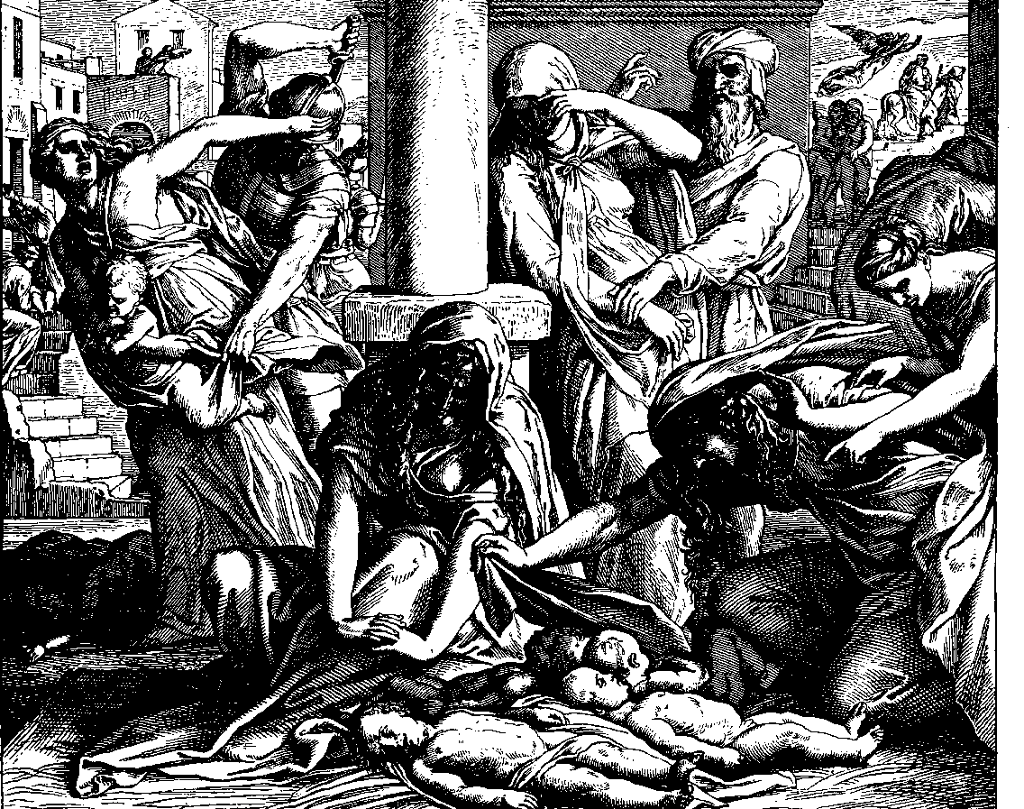 마태오 복음서는 어린이 학살로 알려진 에피소드를 묘사한다. 이 이야기에 따르면, 예수의 탄생 이후, 동방 박사들이 헤로데를 방문하여 "유대인의 왕으로 태어난 자"의 행방을 물었는데, 이는 그들이 그의 별을 동쪽에서 보았기 때문이다. 헤로데는 유대인의 왕으로서 찬탈자의 가능성에 대해 경계했다. 헤로데는 대제사장과 백성의 서기관들을 불러 모아 "기름 부음 받은 자"(Ὁ Χριστός|ho Christosel)가 어디에서 태어날 것인지 물었다. 그들은 베들레헴에서 태어날 것이라고 대답하며, 미가 5:2를 인용했다. 이에 헤로데는 박사들을 베들레헴으로 보내 아이를 찾도록 지시하고, 그를 찾은 후 "나에게도 보고하여 나도 가서 경배하게 하라"고 말했다. 그러나 그들이 예수를 발견한 후, 꿈에서 헤로데에게 돌아가지 말라는 경고를 받았다. 마찬가지로 성 요셉은 꿈에서 헤로데가 예수를 죽이려 한다는 경고를 받고 가족과 함께 이집트로 피신했다. 헤로데는 속았다는 것을 깨닫고 베들레헴과 그 주변 지역에서 두 살 이하의 모든 사내아이들을 죽이라고 명령했다. 요셉과 그의 가족은 헤로데가 죽을 때까지 이집트에 머물렀고, 그 후 헤로데의 아들 아르켈라오스의 통치를 피하기 위해 갈릴리 나사렛으로 이주했다.