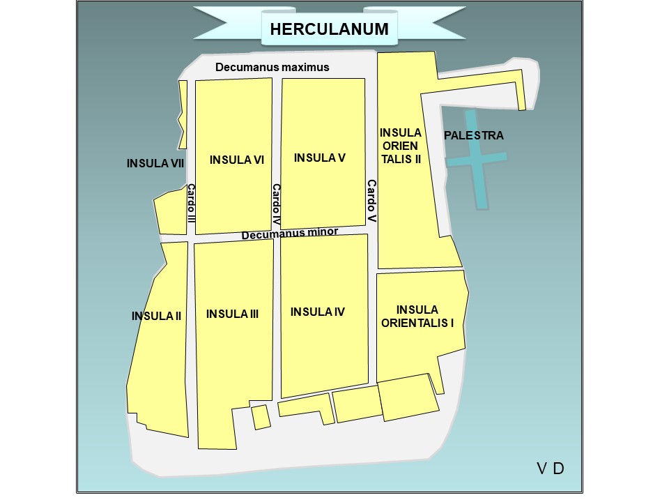 헤르쿨라네움은 동서 방향의 카르도(Cardo)와 남북 방향의 데쿠마누스(Decumanus)가 교차하는 격자형 도시 구조를 가지고 있다. 도시 블록은 인술라(Insula)로 불리며, 인술라 II부터 VII까지는 시계 반대 방향으로, 동쪽에는 오리엔탈리스 I(oI)과 II(oII)가, 남쪽에는 "교외 지역"(SD)이 위치한다. 각 건물에는 고유한 입구 번호가 부여되어 있다. (예: 사슴의 집은 인술라 IV, 3).