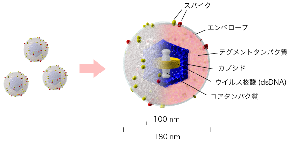 HSV는 비교적 크고 이중 가닥의 선형 DNA 유전자체로 구성되어 있으며, 정20면체 단백질 껍질인 캡시드 안에 갇혀 있고, 지질 이중층인 외피로 싸여 있다. 외피는 테구멘트를 통해 캡시드에 연결된다. 이 완전한 입자를 비리온이라고 한다.[26]HSV-1과 HSV-2는 각각 유전자체 내에 최소 74개의 유전자(열린 판독 틀, ORF)를 포함하고 있지만,[27] 유전자 밀집에 대한 추측으로 인해 94개의 추정 ORF에 의해 최대 84개의 고유 단백질 코딩 유전자가 존재할 수 있다.[28] HSV는 150kbp의 게놈 전체 길이를 가지며, 80종류 이상의 유전자를 코딩하고 있다.