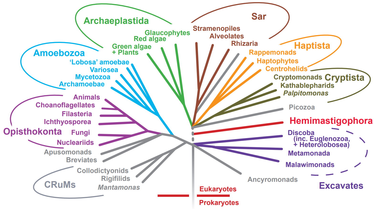 다음은 2022년 제안된 진핵생물 계통 발생의 일부이다. 엑스카바타 생물군 중에서는 디스코바만이 포함되어 있으며,[5] 피코조아가 홍조식물의 가까운 친척이라는 2021년 제안이 포함되어 있다.[6] 프로보라는 2022년에 발견된 미생물 포식자 집단이다.[7] 메타모나다는 디스코바, 아마도 말라이모나스문의 자매일 가능성이 있어 계통 분류가 어렵다.[8][9][10]진핵생물 디포다 디아포레틱케스 크립티스타la 원시색소체생물la (16억 년 전) 홍조식물la (16억 년 전) 로델피스la 피코조아la 회청조식물la (11억 년 전) 녹색식물la (10억 년 전) 헤미마스티고포라류 합티스타la TSARla 텔로네마류la SAR 할바리아la 부등편모조류la 피하낭류la 리자리아la (5억 5천만 년 전) 프로보라 ? 디스코바 ? 메타모나다 ? 안키로모나스류 말라이모나스류 CRuMs 아모르페아 (15억 년 전) 아모르페아 아메바류 오바조아 브레비아타류 ? 아푸소모나스목 후편모생물 (13억 년 전) 홀로미코타la (균류 포함) 홀로조아la (11억 년 전)