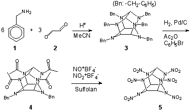 합성 과정은 다음과 같다. 먼저, 벤질아민('''1''')은 산성 및 탈수 조건에서 글리옥살('''2''')과 축합되어 첫 번째 중간체 화합물('''3''')을 생성한다. 이후, 4개의 벤질기는 탄소 담지 팔라듐 촉매 하에 수소를 사용하여 선택적으로 수소화 분해를 통해 제거된다. 생성된 아미노기는 아세트산 무수물을 용매로 사용하여 동일 단계에서 아세틸화되어 중간체('''4''')를 형성한다. 마지막으로, 이 화합물('''4''')을 테트라플루오로붕산 니트로늄 및 테트라플루오로붕산 니트로소늄과 반응시켜 최종 생성물인 HNIW를 얻는다.[6]