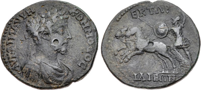 트로이에서 발견된 동전, 177-192년경. 앞면: 콤모두스의 반신상 뒷면: 2두 전차를 타고 방패와 창을 휘두르는 헥토르. 위에 EKTΩP, 아래에 IΛIEΩN이 새겨져 있다. - --