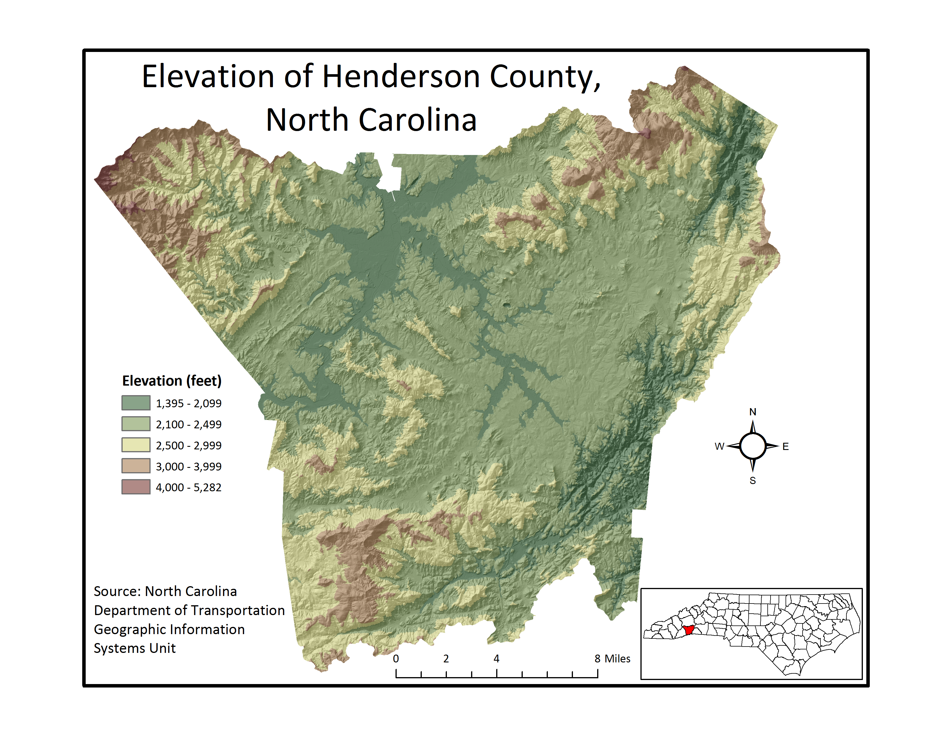 군에서 가장 낮은 지점은 헨더슨과 노스캐롤라이나주의 러더퍼드 카운티의 경계에 있는 브로드 강을 따라 약 425m에 위치해 있다. 가장 높은 지점은 노스캐롤라이나주의 헨더슨-헤이우드 카운티 경계에 있는 리틀 피스가 산(Little Pisgah Mountain)에 위치하며 약 1,609m이다(1,345m의 두 번째 리틀 피스가 산이 노스캐롤라이나주의 헨더슨과 번컴 카운티의 경계에 위치해 있다).[5]