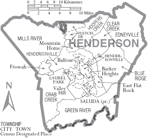 헨더슨빌은 헨더슨군의 군청 소재지이자 최대 커뮤니티이다. 헨더슨빌은 도시 중심의 성격을 띠며 인구도 가장 많다. 살루다는 헨더슨 카운티에 위치한 또 다른 도시이다. 헨더슨군에는 5개의 지방 자치 단체가 있는데, 헨더슨빌을 제외한 나머지 자치 단체들은 도시적인 모습이 적고, 특정한 문화나 역사적인 지역을 보존하기 위해 만들어졌으며, 인접한 타운이나 시에 병합되는 것을 피하고 있다.