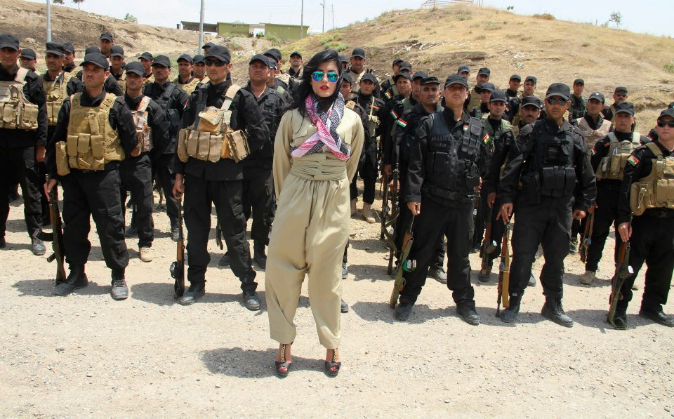 쿠르드 팝스타 헬리 러브가 2014년 7월 5일 도후크의 기지에서 쿠르드 페쉬메르가 군인들 앞에서 포즈를 취하고 있다.