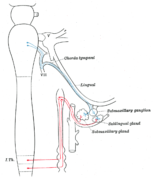 얼굴신경의 가지인 고실끈신경은 혀의 앞쪽 2/3에서 오는 미각 섬유와 부교감신경 섬유를 턱밑신경절로 전달한다.[1]