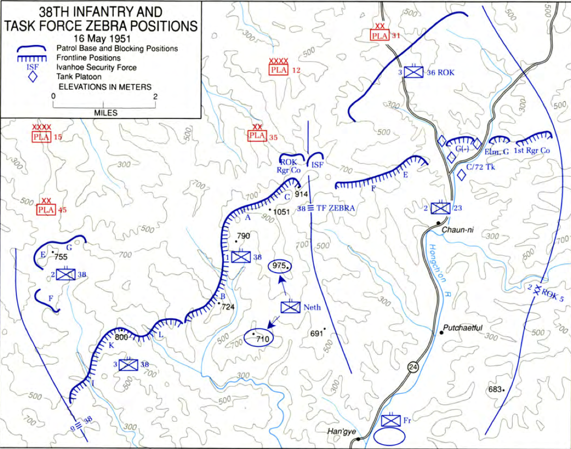1951년 5월 16일, 제38보병 연대와 ''태스크 포스 제브라''의 위치