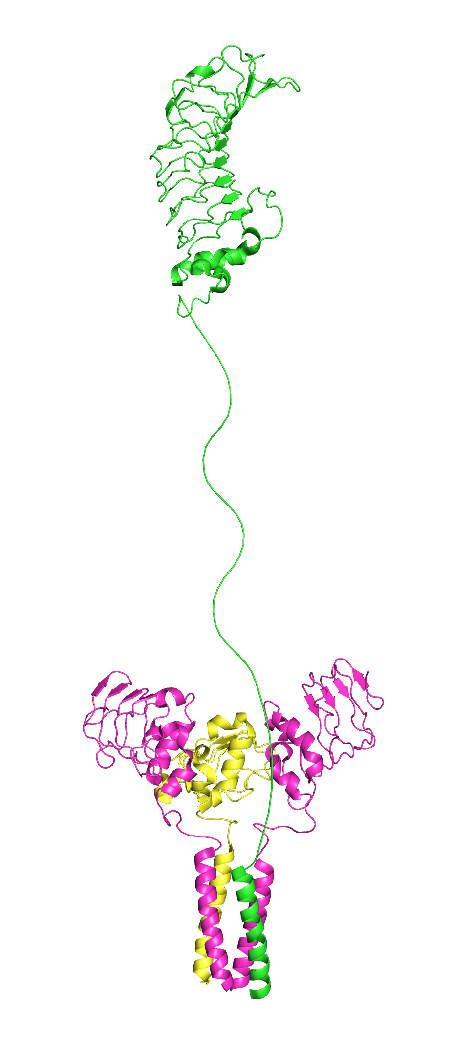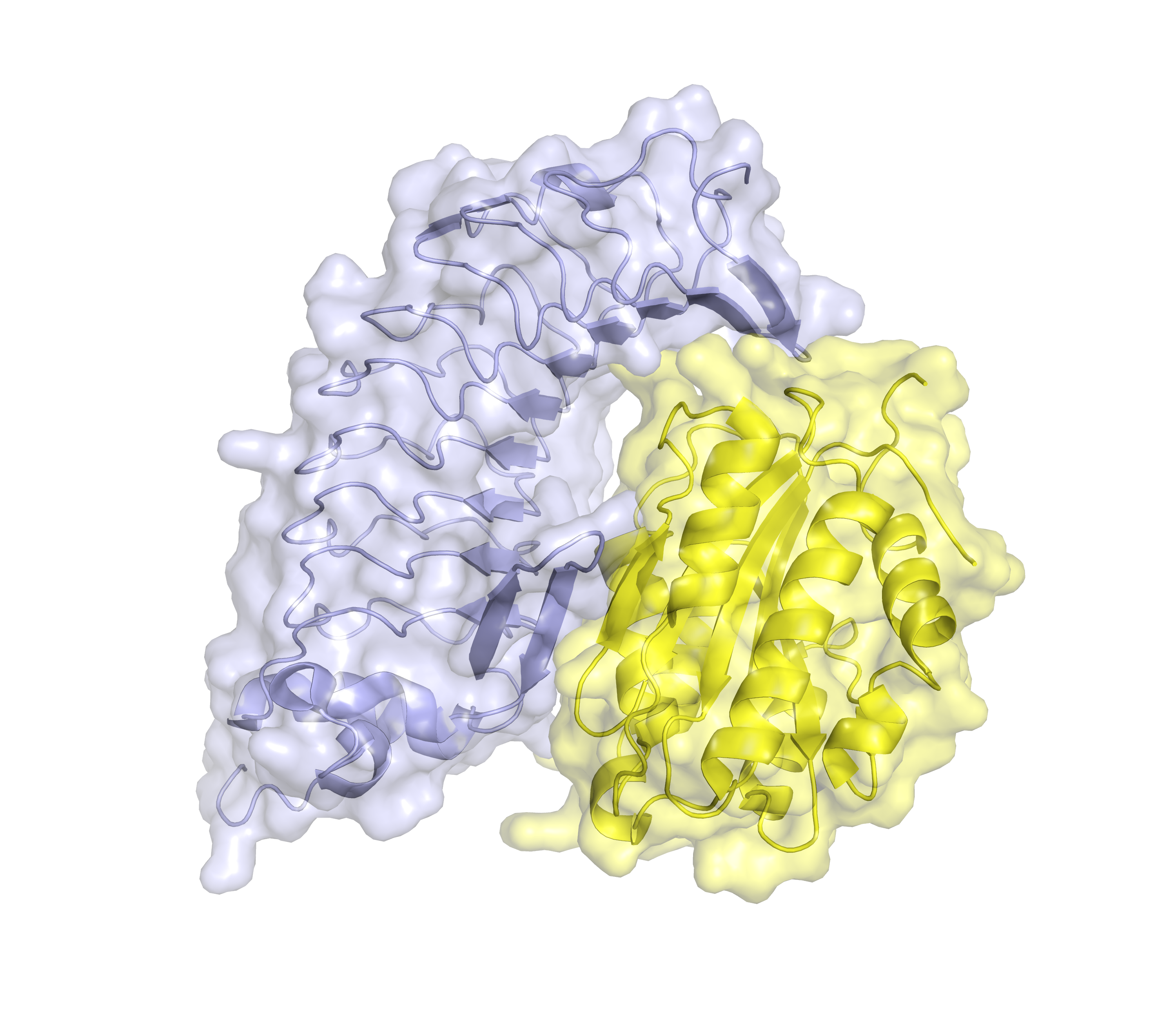 vWF와 GP1b 알파의 상호 작용. 혈소판 표면의 GP1b 수용체는 혈소판이 혈관 손상 시 노출되는 vWF에 결합하도록 한다. vWF A1 도메인(노란색)은 GP1ba(파란색)의 세포외 도메인과 상호 작용한다.
