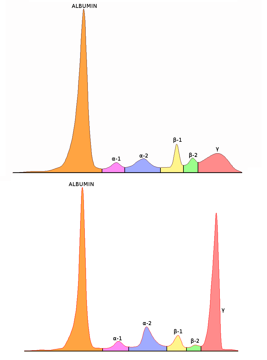 혈청의 총 단백질 주성분은 알부민(ALB) (60%)과 글로불린 (20%)이다. 병원균 등의 항원이 체내에 있는 경우, 이들을 공격하는 글로불린 값은 높아지는 반면 알부민 값은 낮아지지만, 총 단백질량은 크게 변하지 않는다. 만성 염증, 간경변, 악성림프종 등의 경우 글로불린이 고농도가 된다. 다발성골수종이나 탈수증에서는 특히 값이 높아진다.[9]3. 2. 혈청 지질