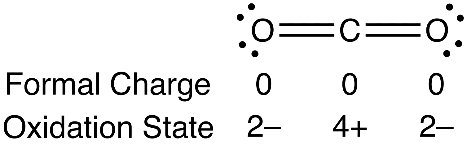 이 값들의 차이는 형식 전하와 산화수가 분자 내 원자 간의 전자 분포를 바라보는 방식이 근본적으로 다르기 때문이다. 형식 전하에서는 각 공유 결합 내의 전자가 결합 내 두 원자 사이에 정확히 균등하게 분할된다고 가정한다. CO2 분자에 대한 형식 전하 관점은 아래와 같다.