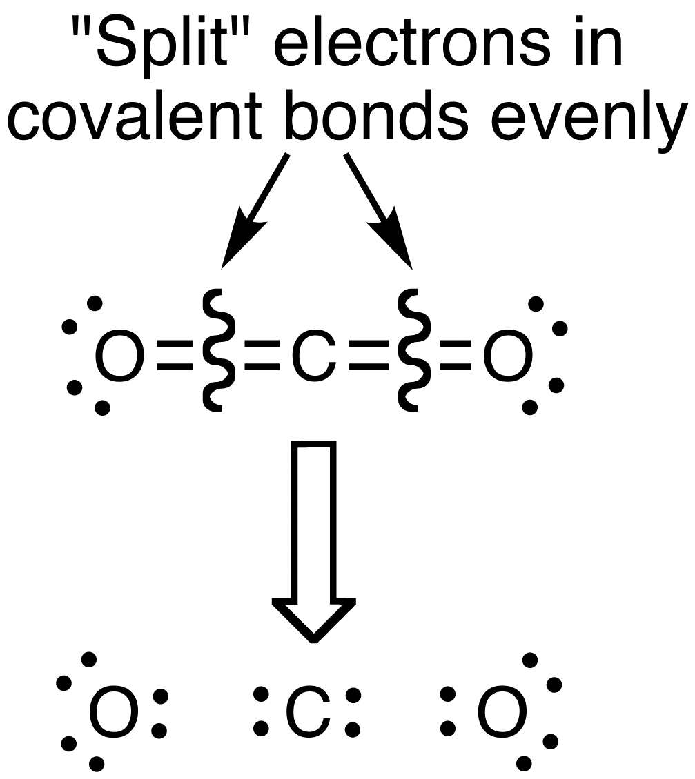 이 값들의 차이는 형식 전하와 산화수가 분자 내 원자 간의 전자 분포를 바라보는 방식이 근본적으로 다르기 때문이다. 형식 전하에서는 각 공유 결합 내의 전자가 결합 내 두 원자 사이에 정확히 균등하게 분할된다고 가정한다(따라서 위에서 설명한 방법에서 2로 나눈다). CO2 분자에 대한 형식 전하 관점은 아래와 같다.