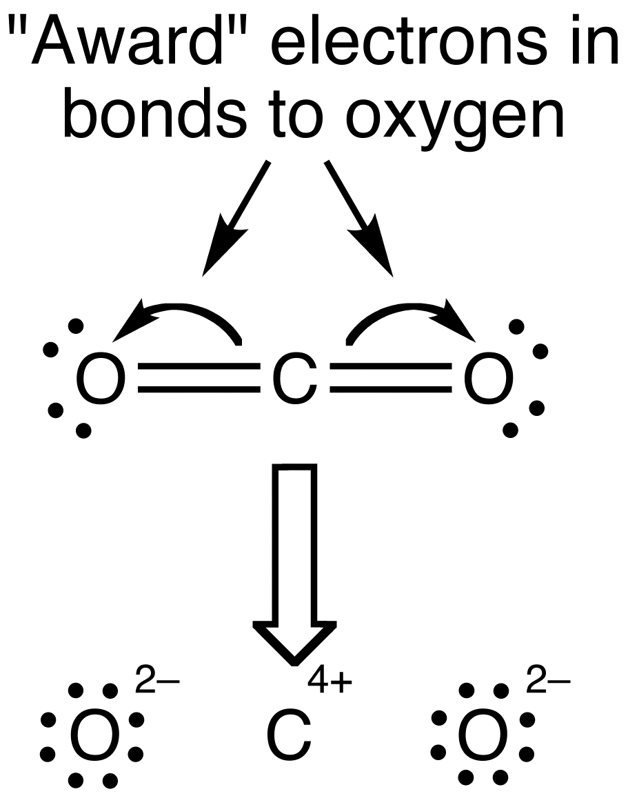 산화수 형식주의에서는 결합 내의 전자가 더 큰 전기음성도를 가진 원자에 "수여"된다. CO2 분자에 대한 산화수의 관점은 아래와 같다.