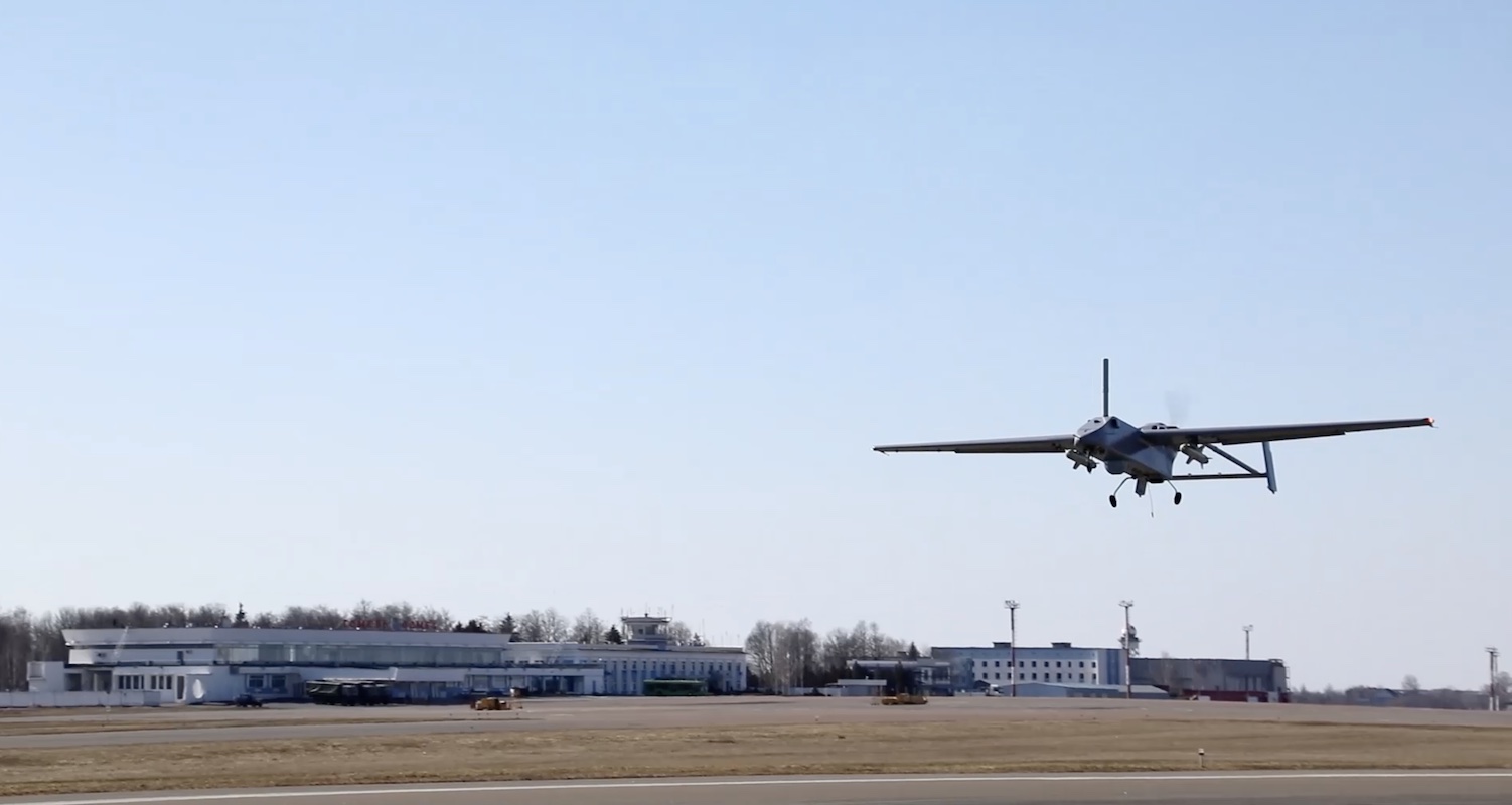 2022년 3월 우크라이나 공습 당시 고멜 공항 활주로에서 이륙하는 무인 항공기를 보여주는 러시아 국방부 비디오 스크린샷.