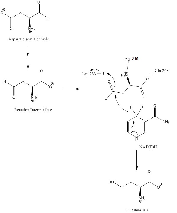 C4 카복실산이 유기 산화 환원 반응으로 알데히드로 환원되고 C1 알데히드가 카복실산으로 산화되면, 실험 결과에 따르면 Asp 219, Glu 208 및 물 분자가 활성 부위에서 ASA와 결합하는 동안 Lys 223이 아스파르트산 세미알데히드 C4 산소에 양성자를 기증한다. 호모세린 탈수소효소는 NAD(P)H 보조 인자를 가지고 있으며, 이는 동일한 탄소에 수소를 기증하여 알데히드를 알코올로 효과적으로 환원시킨다.[4] (그림 1과 2 참조).