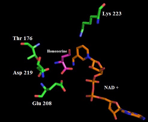 호모세린 탈수소효소는 아스파르트산 세미알데히드(ASA)를 호모세린으로 전환하는 반응을 촉매한다. 전체 반응은 ASA의 C4 카복실산 작용기를 1차 알코올로 환원시키고 C1 알데히드를 카복실산으로 산화시킨다. Glu 208과 Lys 117 잔기는 효소의 활성 촉매 부위에 관여하는 것으로 생각된다. Asp 214와 Lys 223은 촉매 반응에서 수소화물 이동에 중요함을 보여주었다.[4]