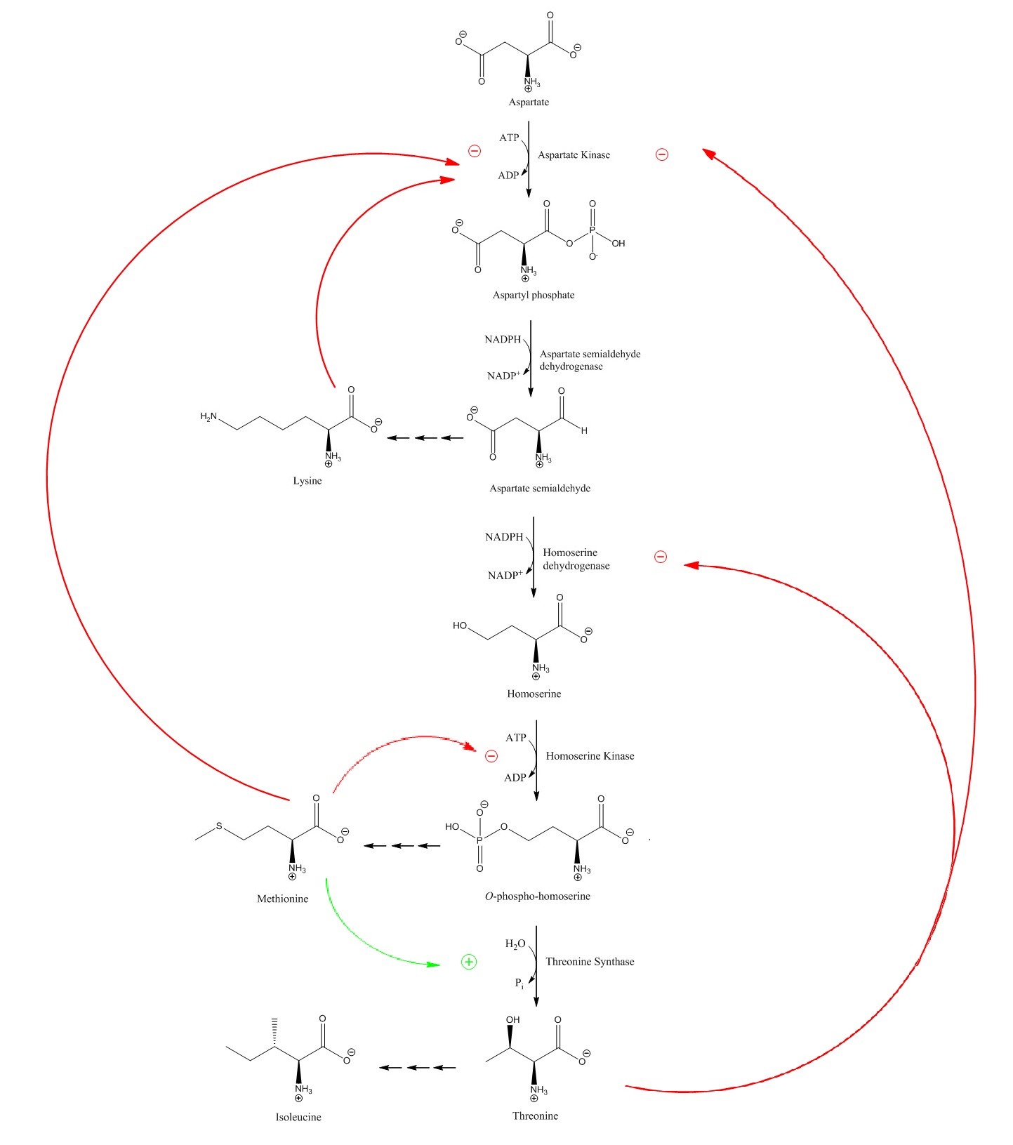 호모세린 탈수소효소(HSD)와 아스파테이트 키나아제(AK)는 생물학적 조절을 받는다. HSD는 주로 트레오닌에 의해 억제되며, 트레오닌은 HSD와 AK 모두에 대해 경쟁적 억제로 작용한다.[14] AK-HSD를 발현하는 유기체에서 트레오닌 결합 부위 중 하나는 AK와 HSD 사이의 링커 영역에서 발견되어 알로스테릭 조절 가능성을 시사한다.[6]